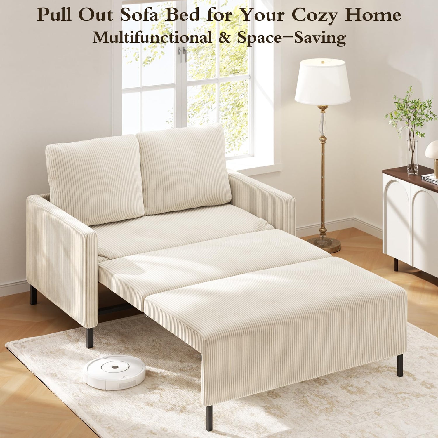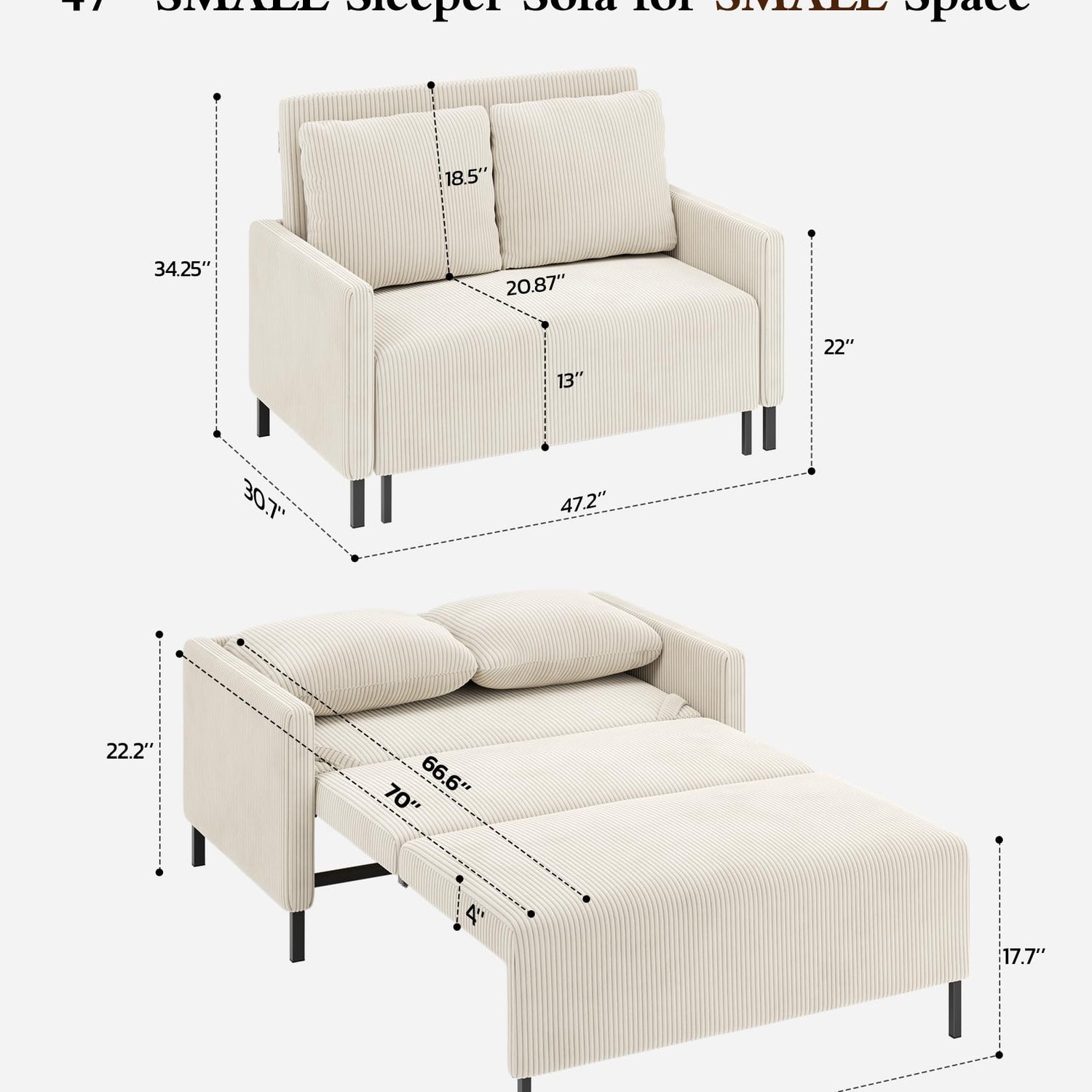 Corduroy Convertible Sofa Bed, 47" Loveseat Sleeper Sofa, Pull out Couch 618lbs Capacity, Modern Sleeper Couch Bed 2 Fluffy Pillows Included, Small Couches for Small Spaces/Apartment/Office, Beige