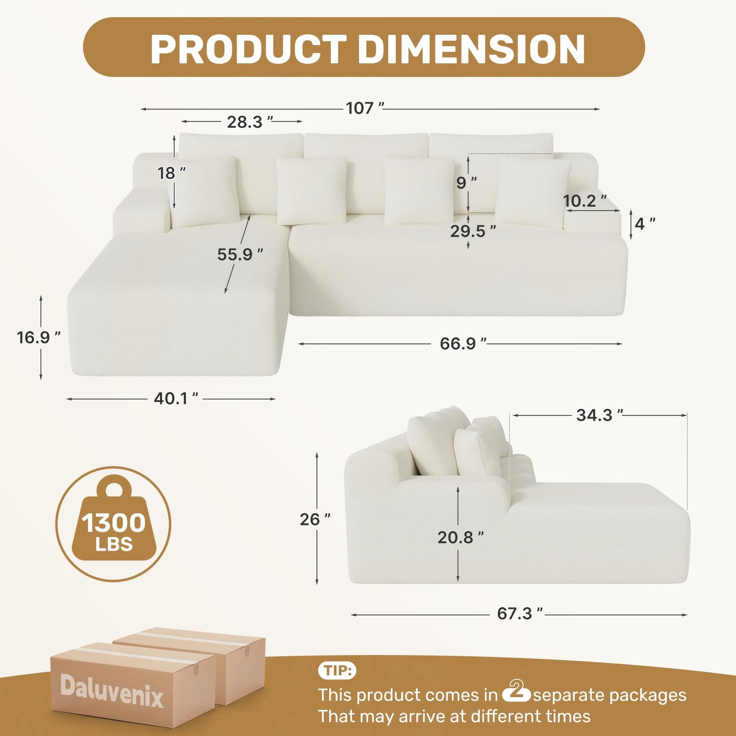 • Tips: The Sectional sofa has a large volume and will be delivered in two packages, which may arrive at different times. Due to the sponge rebound, when just unpacked, the size may deviate from the picture size