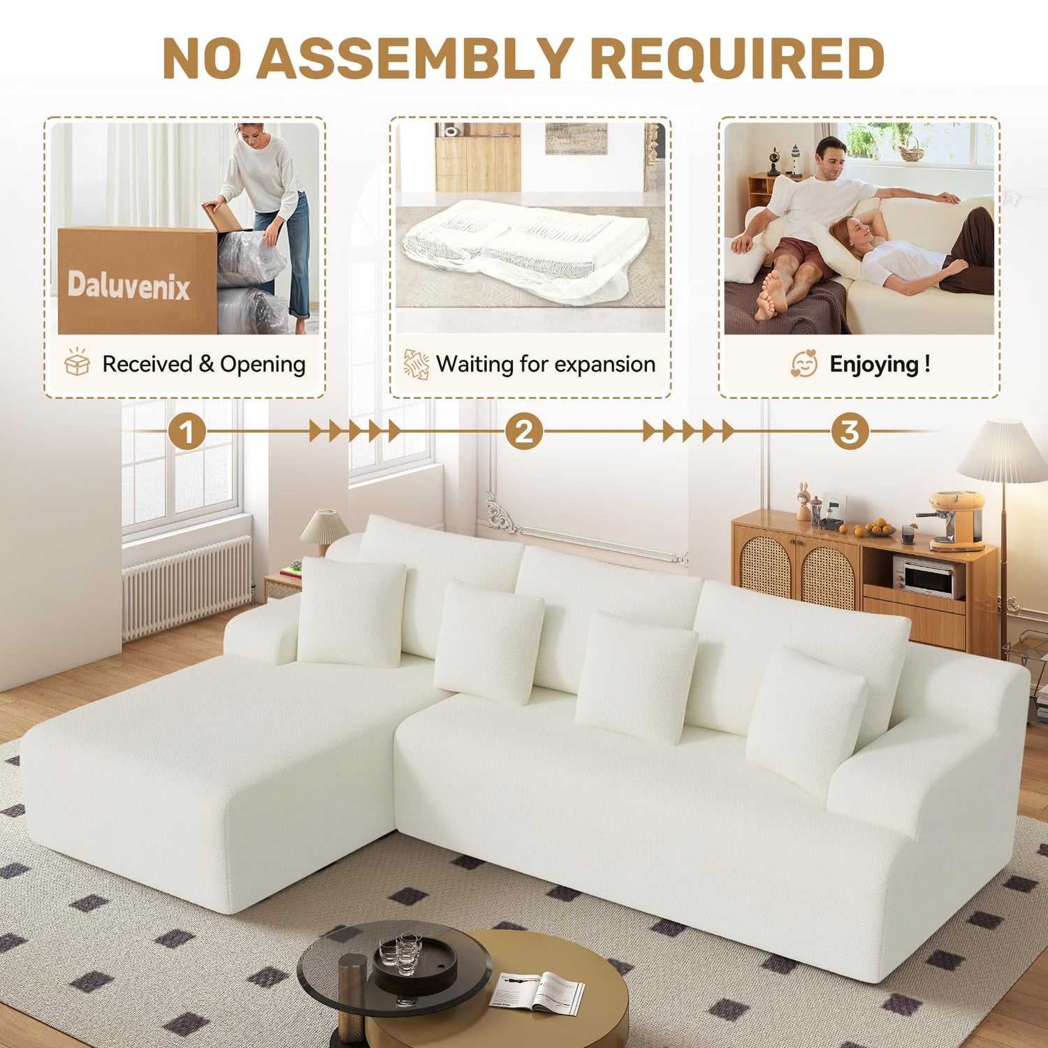 • Quality Service: When unpacking the vacuum package, pat the L-shaped couch, and let it absorb air for about 2 to 3 days to restore it to its original status. If you have any questions about our sofa, please contact us as soon as possible