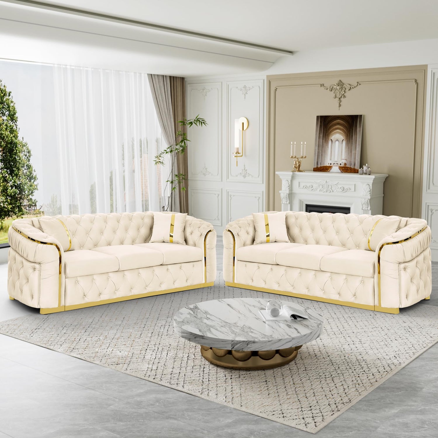 DAMAIFROM Mid Century Modern Chesterfield Sofa Couch, 90.6" Velvet Couch White and Gold Sofa Luxury Loveseat for Living Room, Tufted Sofas with 2 Pillows & Classic Golden Decor, Cream White