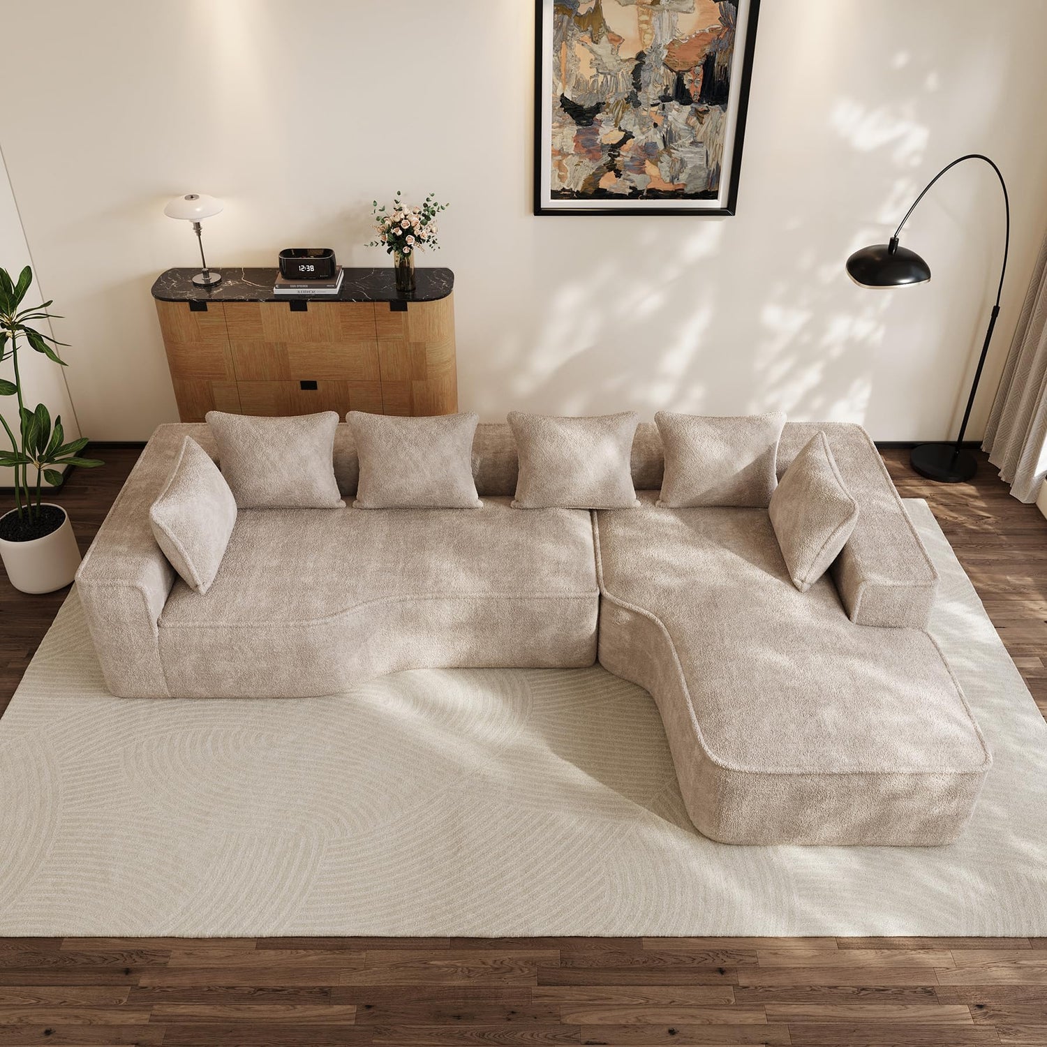 - 【No assemble needed】This modular sectional sofa with overall size: 134" W x 74.3"D x 25.5"H. The living room couch no requires assembly, allowing you to enjoy its luxurious comfort easily.