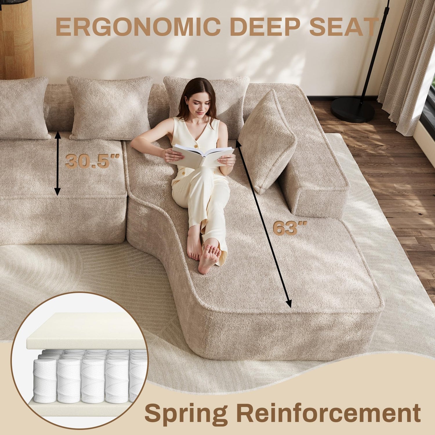 - 【Deep Seat】With 30.5"D-37"D deep seat for great relaxation when sitting on this oversized l-shaped sofa. And 63"D deep seat chaise lounge which can help you enjoy a reclining or napping or sleeping after watching TV or playing phones.