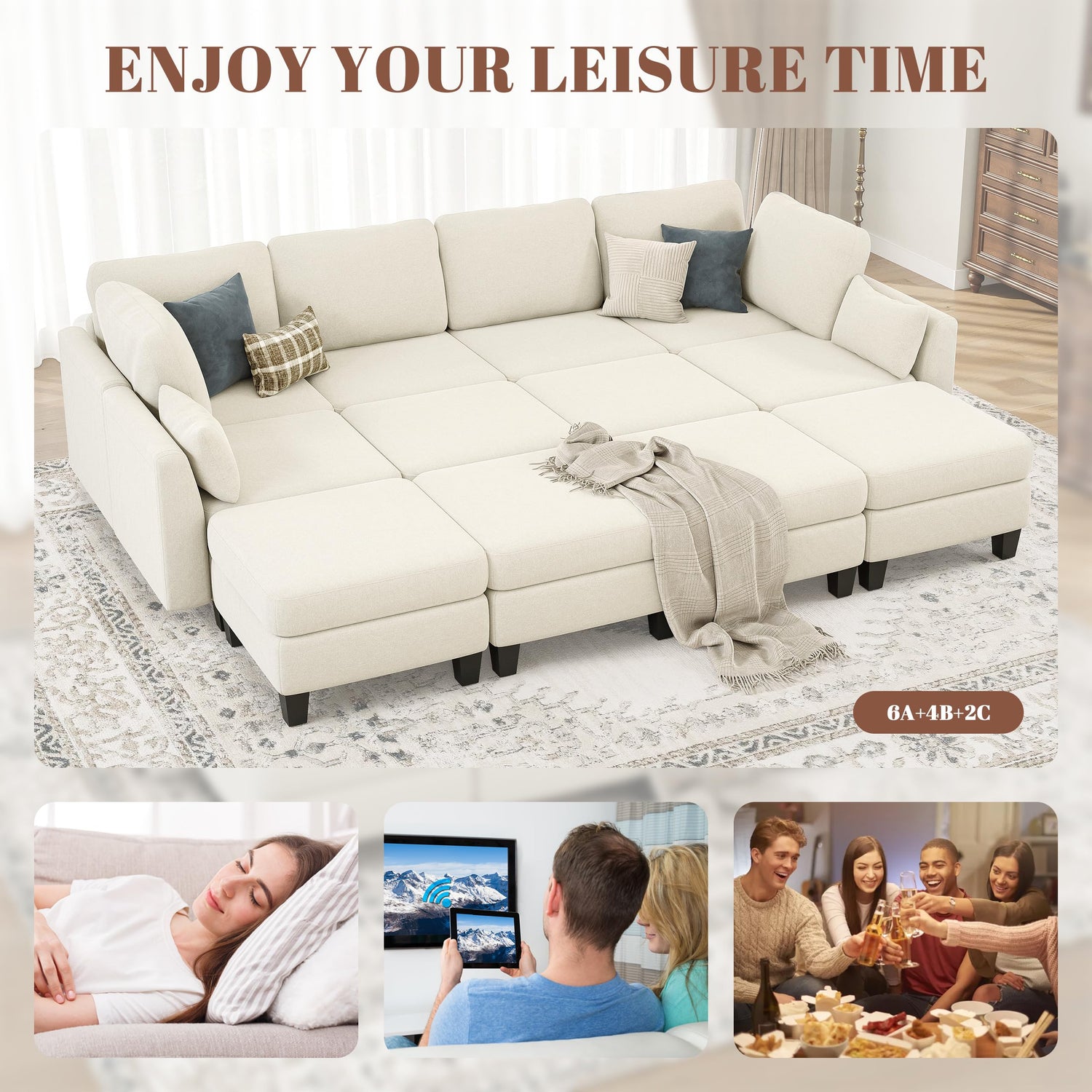 Dowiean Sectional Sleeper Sofa, 6 Seaters Modular Sleeper Sofa Couch, Comfy Sectionals Couches Bed, Convertible Sofas with Ottomans, Modular Sectional Couches for Living Room, Beige