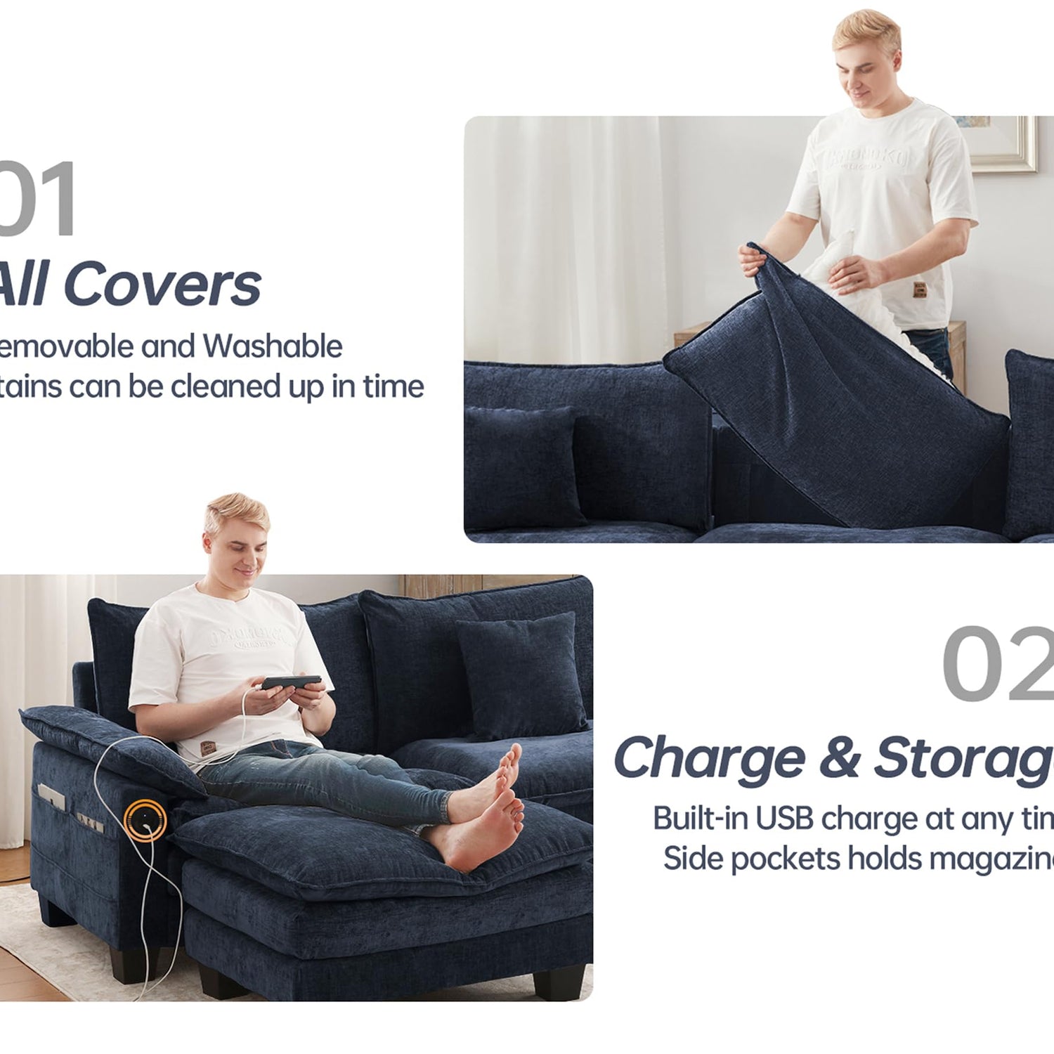 • 【Easy Assembly】Overall size: 76.8"L x 32.3"W x 33.5"H. A detailed manual is provided for straightforward assembly. The Cozy Cloud Sofa ships in 2 parts. Contact us anytime if you have any questions.
