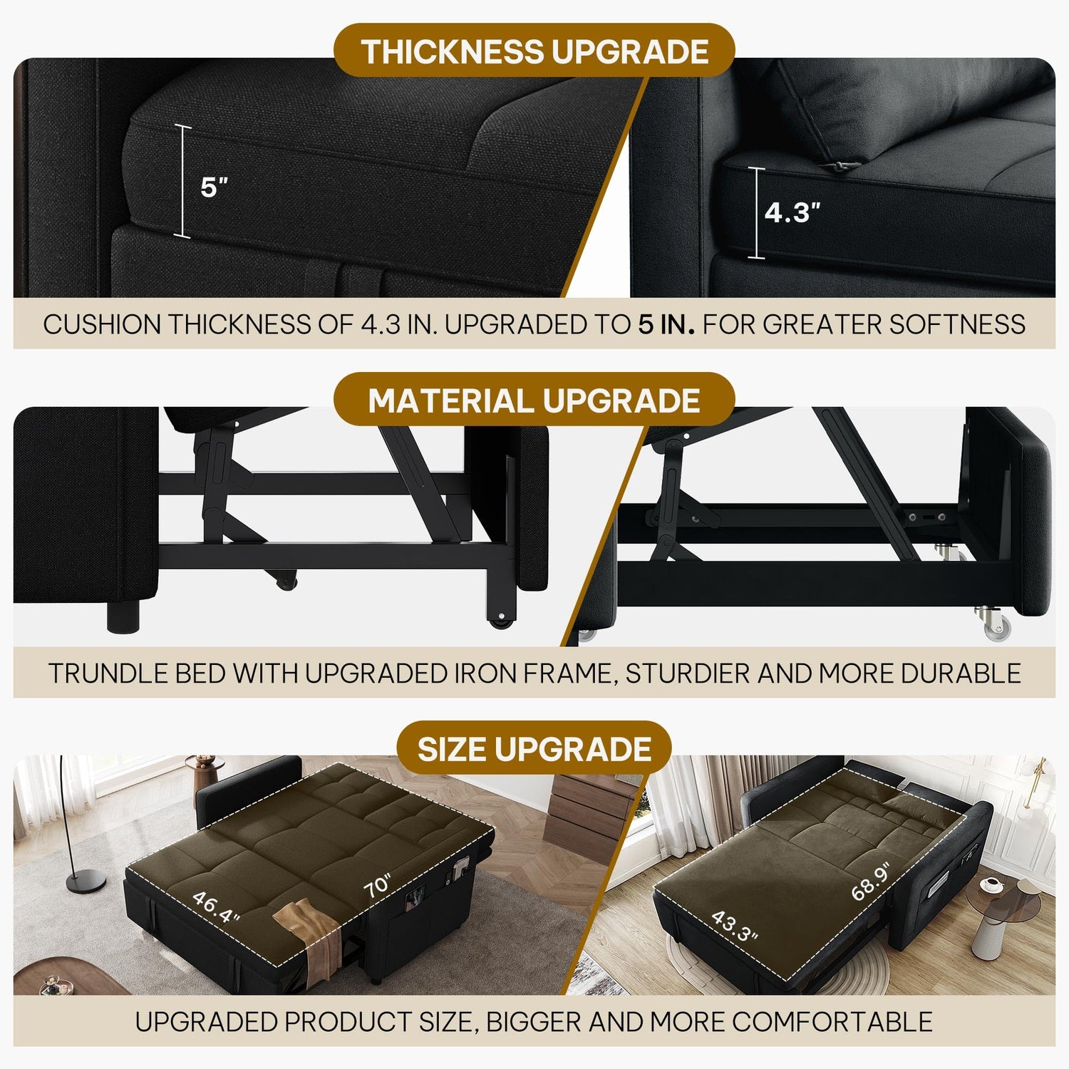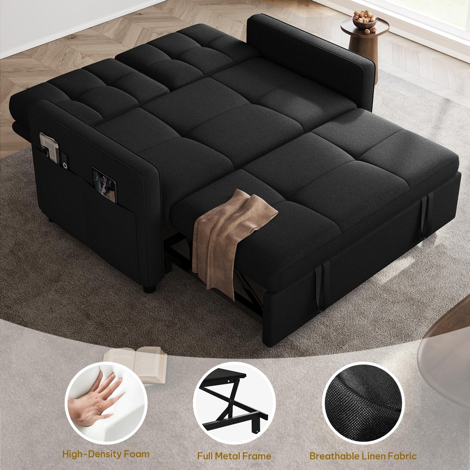 DWVO 55" Convertible Sofa Bed, 3-in-1 Sleeper Sofa with Pull-Out Bed, Linen Futon Couch with Adjustable Backrest and Side Pocket, Modern Loveseat for Living Room Apartment, Balck