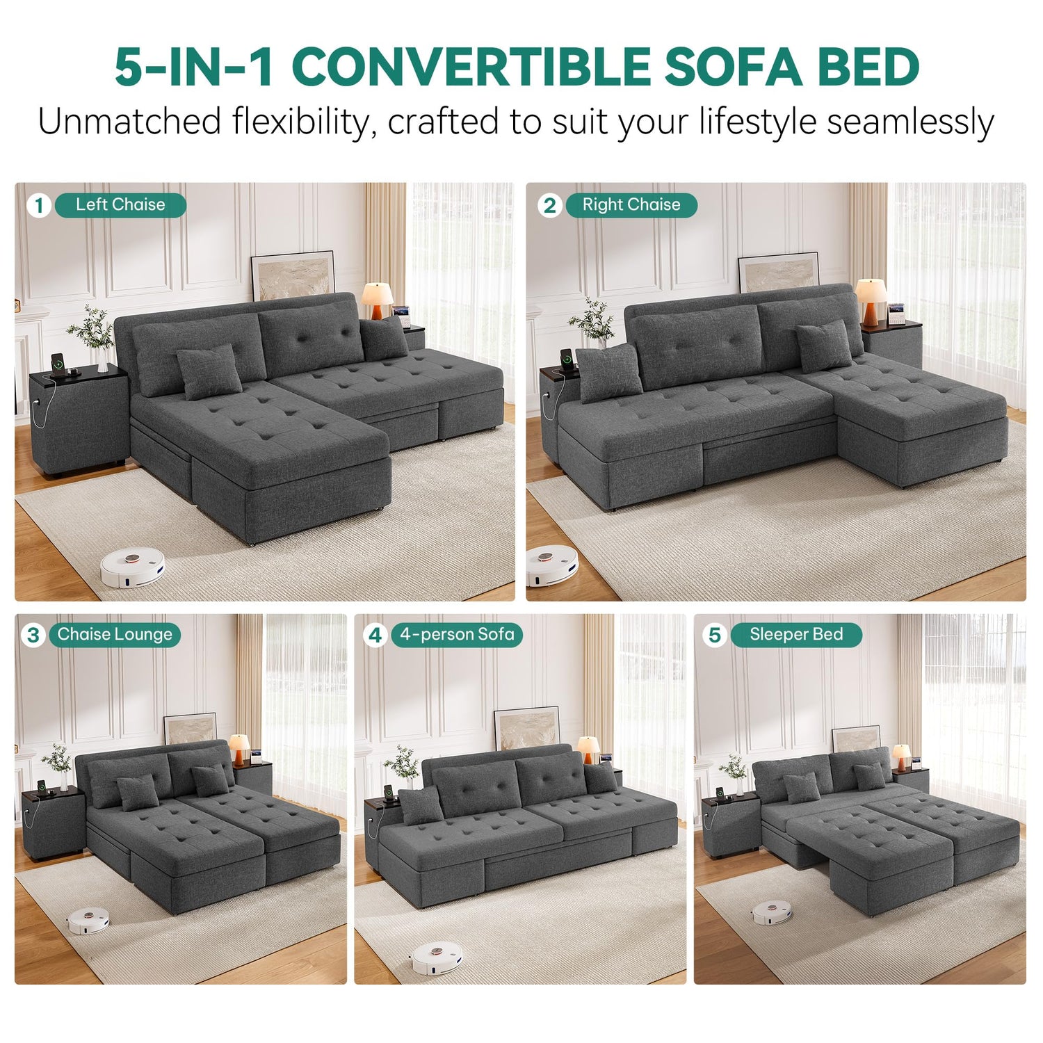 DWVO Queen Size Sofa Bed, 5-in-1 Multi-functional Convertible Sleeper Sofa with 2 Storage Cabinet Nightstand & USB Ports, 100" Sectional Sofa Couch with 2 Comfy Pillows for Living Room Apartment, Grey