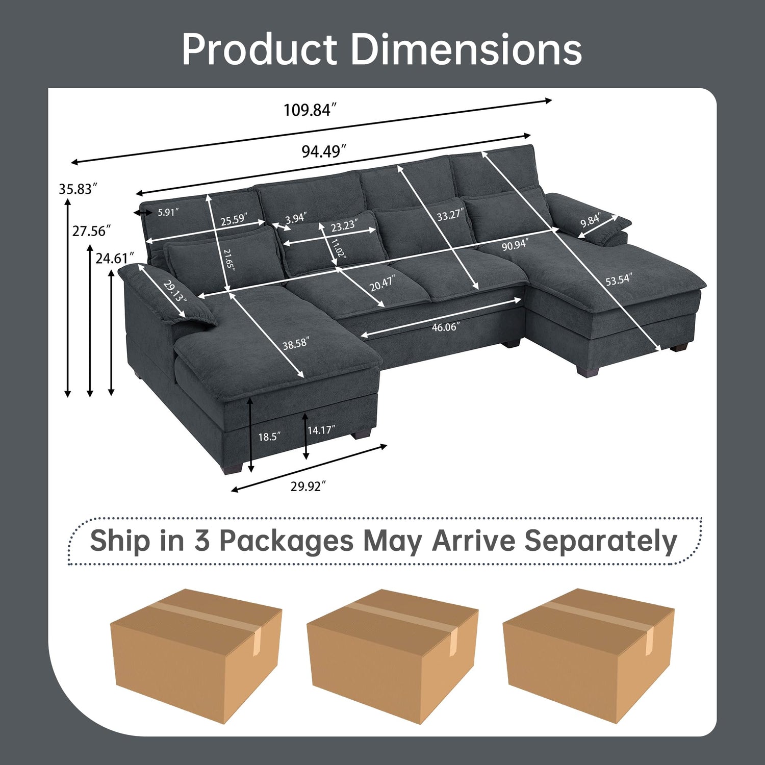 - Buy with Confidence: Please note that your 4 seat sectional sofa will arrive in three separate packages, which may arrive at different times. For any questions or concerns, we are always here to help. Enjoy the excitement of assembling your 110" u shaped cloud couch!