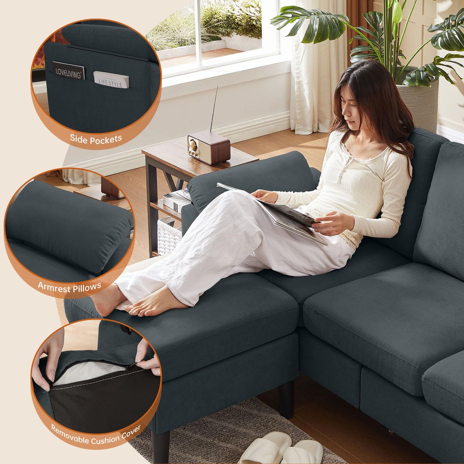 - Removable Cushion Covers: Keeping your L shape sofa looking pristine has never been simpler. This 3 seat sectional sofa features zip-off covers that are fully machine washable, making it easy to keep every section of your convertible sectional sofa looking fresh and clean.