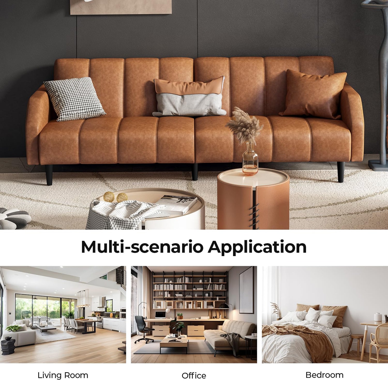 • Mid-Century Inspiration - The overall inspiration for the futon sofa comes from mid-century leather sofa, which have been improved in the details by adopting a modern and minimalist line design. Linear and uncluttered look create a sense of gentle simplicity, making it easy to incorporate into a wide range of decorative style. With soft grain and matte finishing, the leather sleeper sofa is a perfect balance of style and comfort.