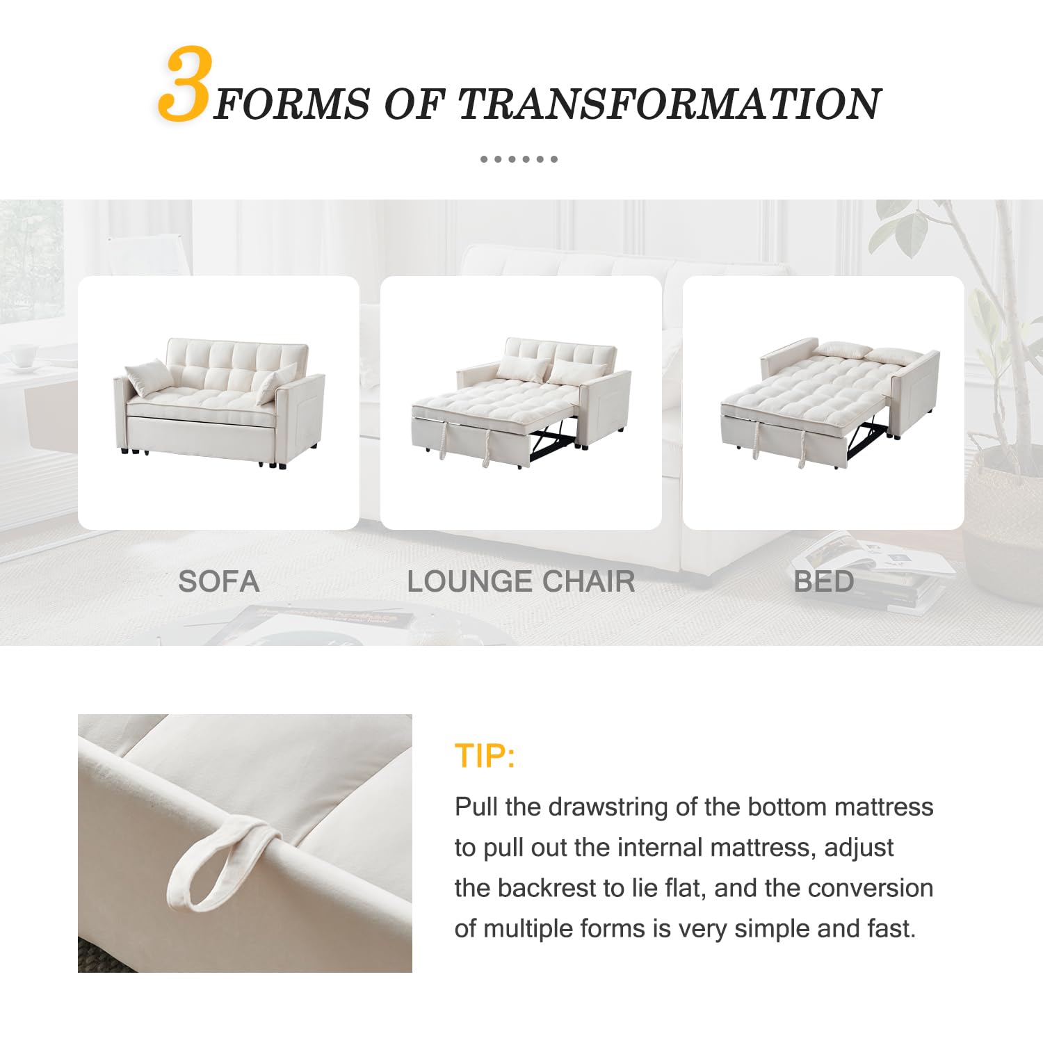 FENFSHE Futon Sofa Bed, Modern Velvet 3 in 1 Convertible Sleeper Sofa Couch Bed, Pullout Couch Bed with Adjustable Backrest, Storage Pockets and Toss Pillows for Living Room, Bedroom (Beige)