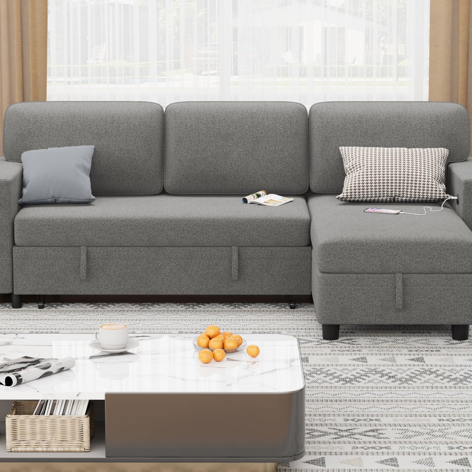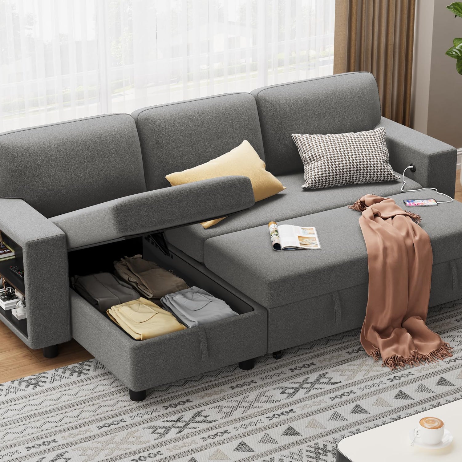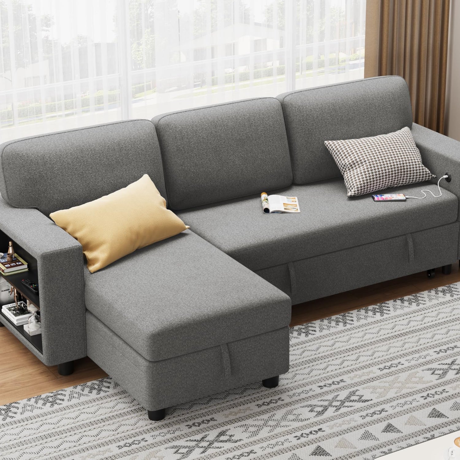 Details: This Flamaker sofa bed, a versatile and stylish addition to your living space. This convertible modular sectional sofa effortlessly transforms into a comfortable bed, perfect for both relaxing and accommodating overnight guests. Featuring a large built-in storage compartment, it helps keep your home organized by providing ample space for blankets, pillows, and other essentials. The sofa also includes two built-in bookshelves, ideal for displaying books and decorative items. Upholstered in comforts fabric, it adds a touch of elegance and warmth to any living room or apartment. Additionally, built-in USB ports ensure you can charge your devices conveniently while you unwind.