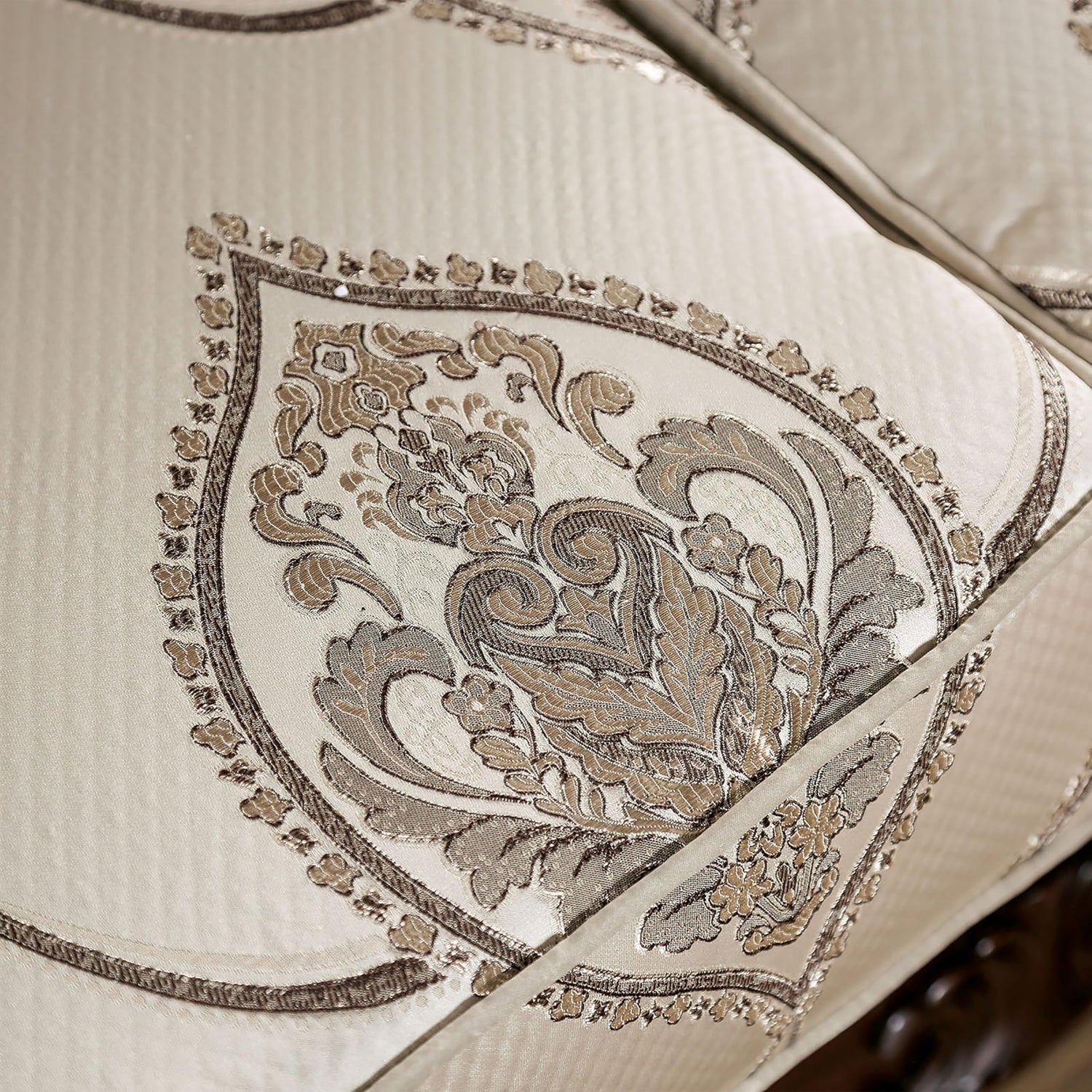 This bedroom loveseat features carved details and solid wood construction, exuding timeless elegance and durability.