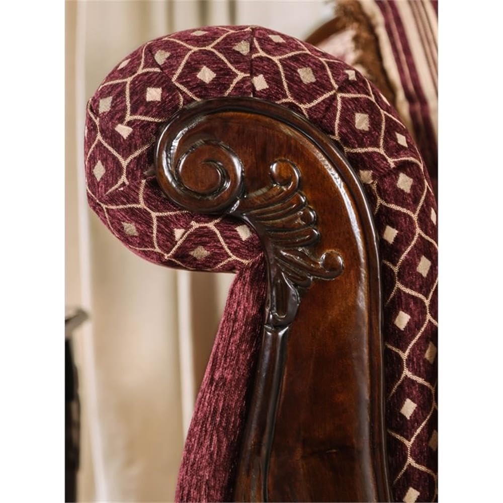 Details: The Furniture of America Eli Traditional Faux Leather Tufted Sofa is truly remarkable. Made in the USA, this living room piece features a sumptuous blend of dark brown and burgundy faux leather and chenille fabric. Gorgeous floral and geometric patterned design catch attention while timeless floral carvings on the solid wood and veneer frame and center tufts polish the rich design.