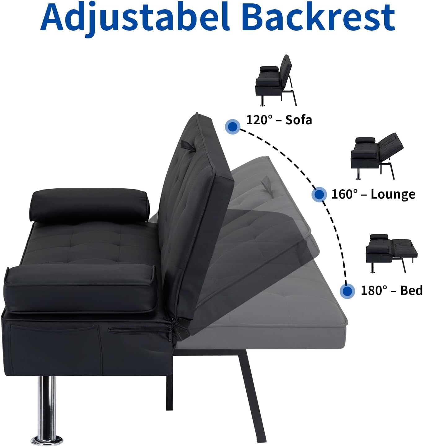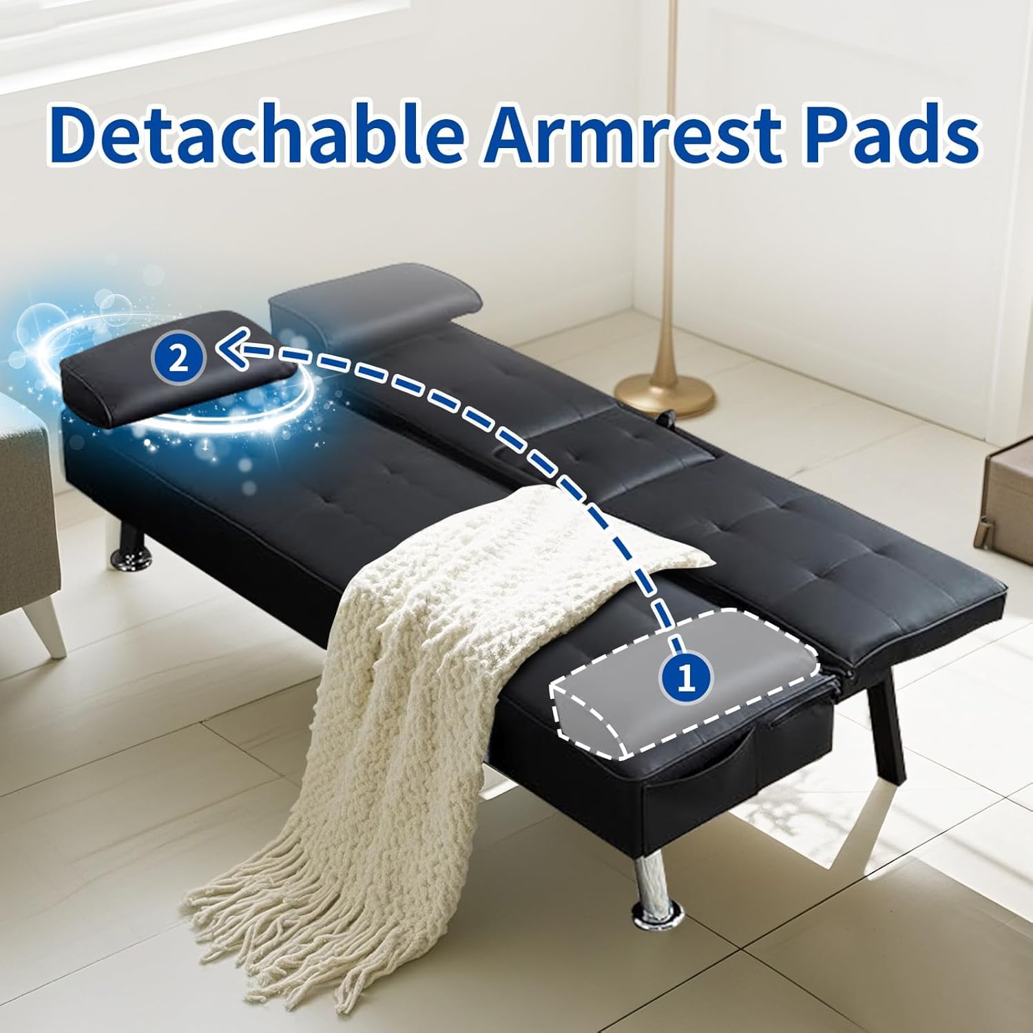 Futon Sofa Bed Convertible Loveseat Sleeper Couch Modern PU Leather Upholstery Folding Recliner Sofá, Small 2 Seaters Futon Sofa&Couch, Accent Couches with Cup Holders for Living Room