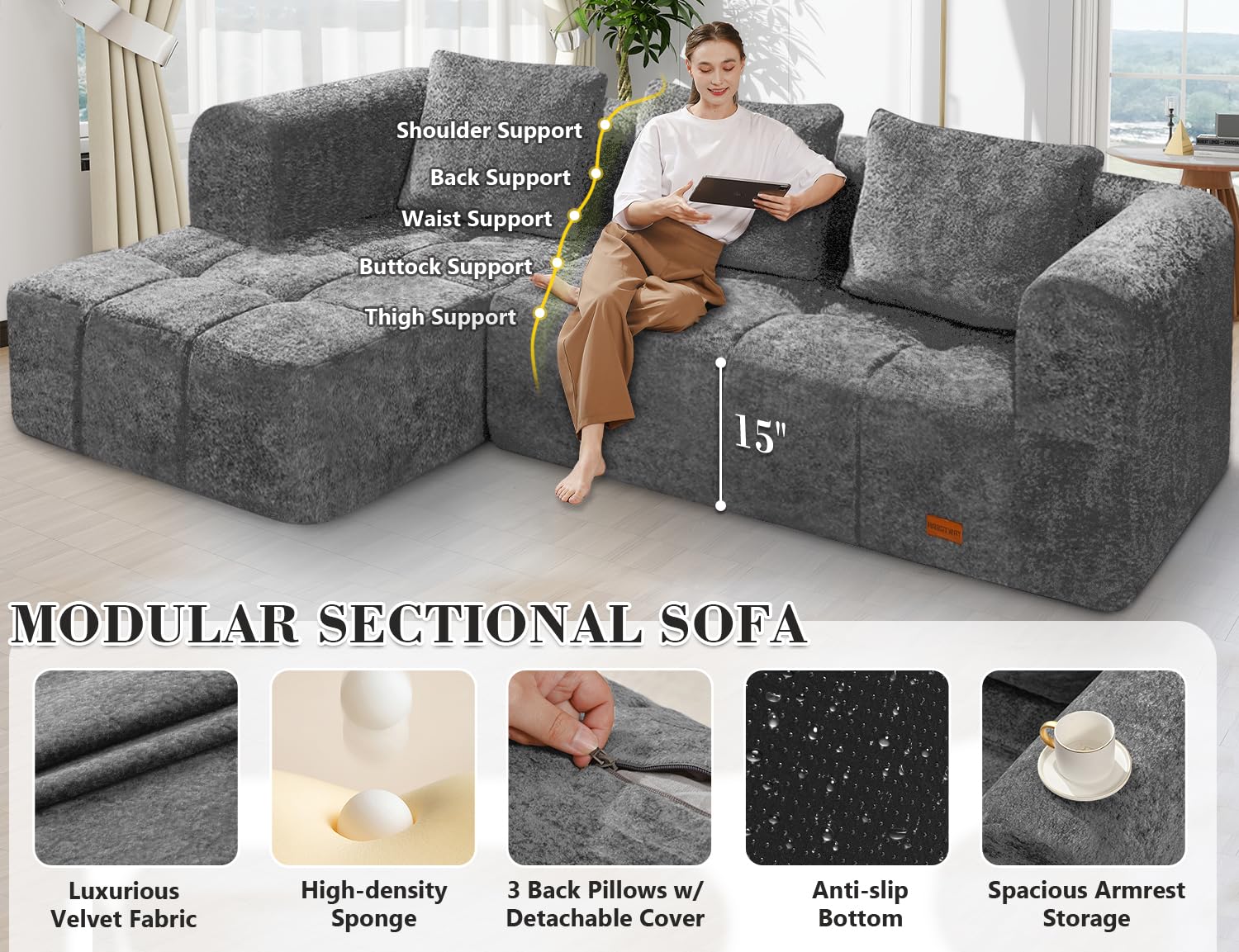 - Cloud-Like Comfort: Sink into high-resilience foam cushions, designed for all-day relaxation. Includes 3 oversized velvet pillows for extra lumbar support and style.