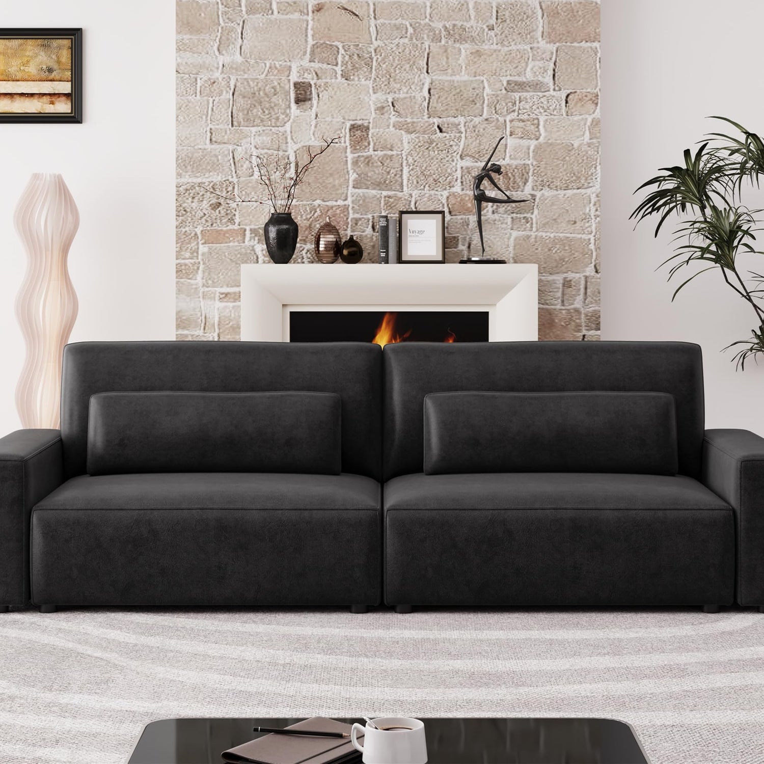 HIFIT 105" Black Faux Leather Sofa Couches for Living Room, Modern Comfy Couch with 28" Deep Seat & Fluffy Cushion, 4-Seater Home Sofa Living Room Furniture for Office with 2 Pillows, Solid Wood Frame