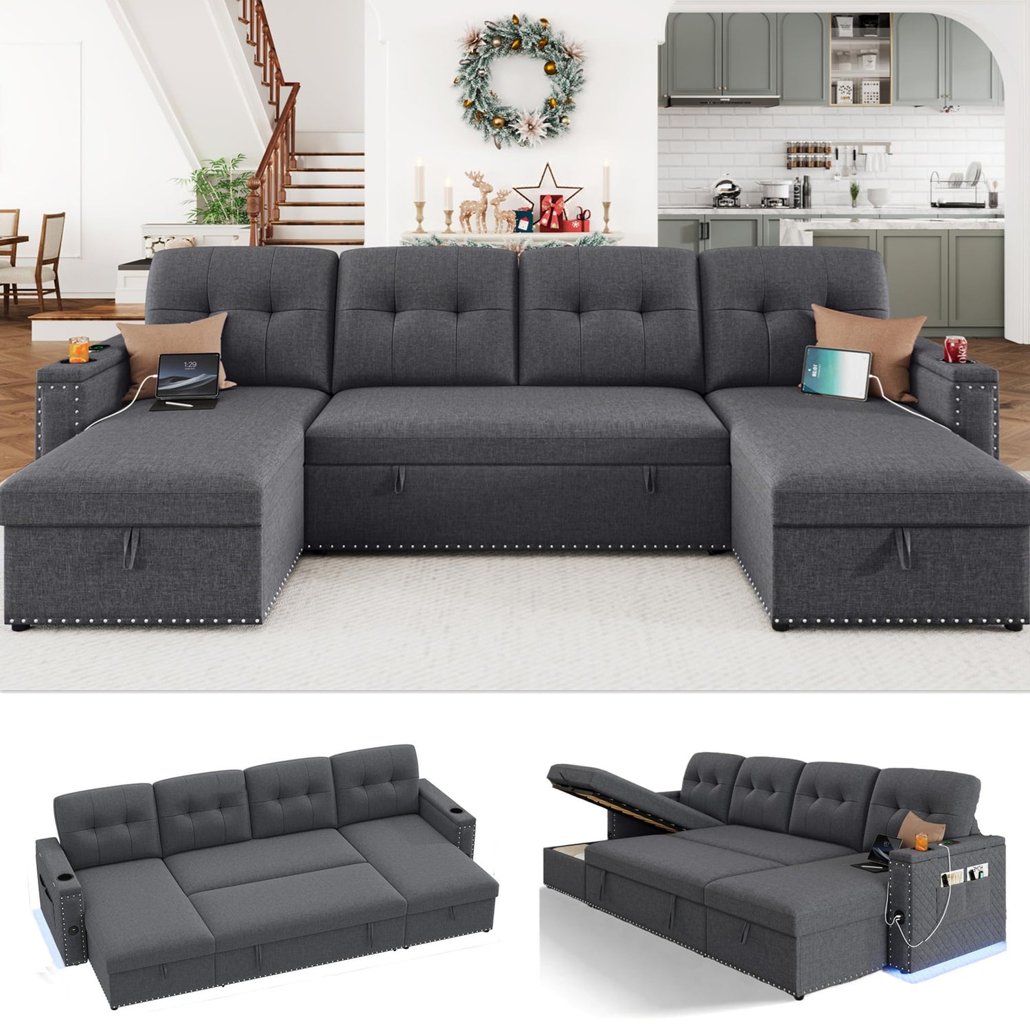 HIFIT 112" Sectional Couches for Living Room- Pull Out Sleeper Sofa Couch w/Storage Chaise,Storage Armrest,LED Light&USB Port&Cupholder, Modern Linen U Shaped Home Sofa Living Room Furniture Set, Grey
