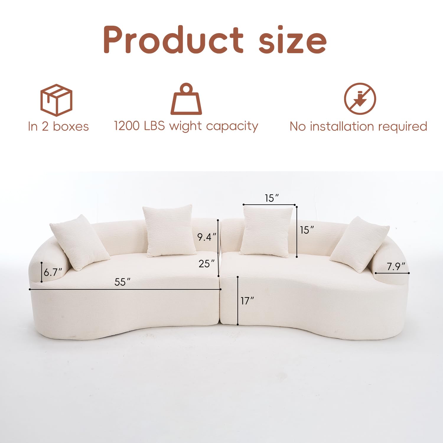 • Perfect Size Information: The size of our curved couch is 110*39.4*25.6", weight 107.4 lbs, and the maximum load capacity of a single seat is 1200 lbs.The size is suitable for most house types. Whether living room, bedroom, office or apartment, it can all adapt perfectly.