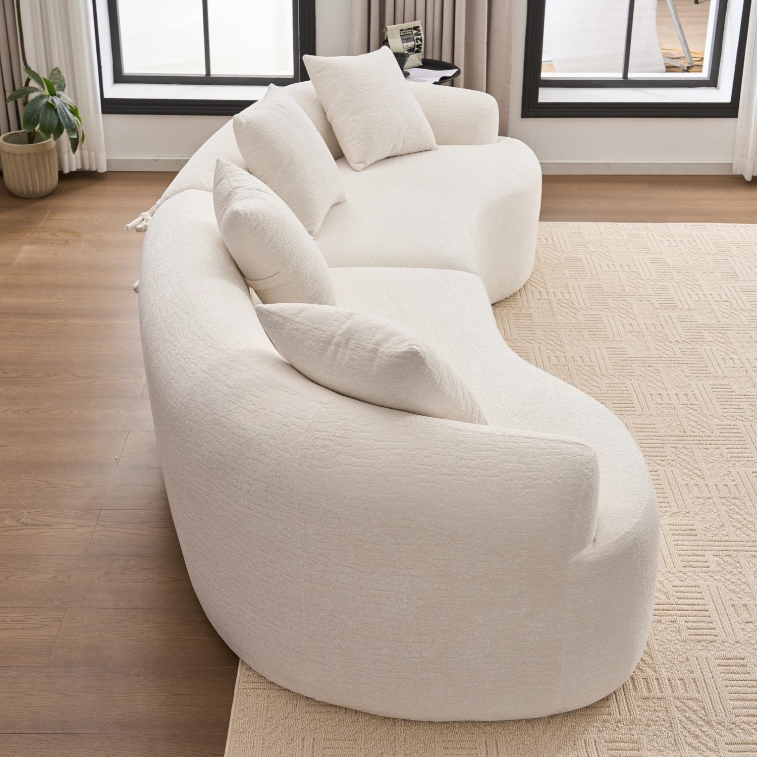 • Elegant Curved Design: Our curved sectional sofa features an elegant two-piece design, conforms to the simple and modern design concept, adding warmth and refinement to the living room. 25 " deep seat allows you to stretch your body better, and the 4 throw pillows provide more comfortable support. After work, sit or lie on it to clear away the troubles and fatigue of the day. The unique curve shape promotes natural conversation and interaction.