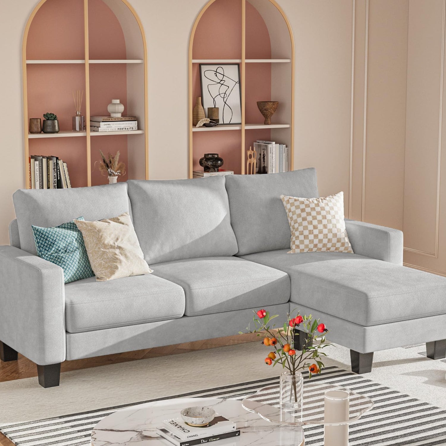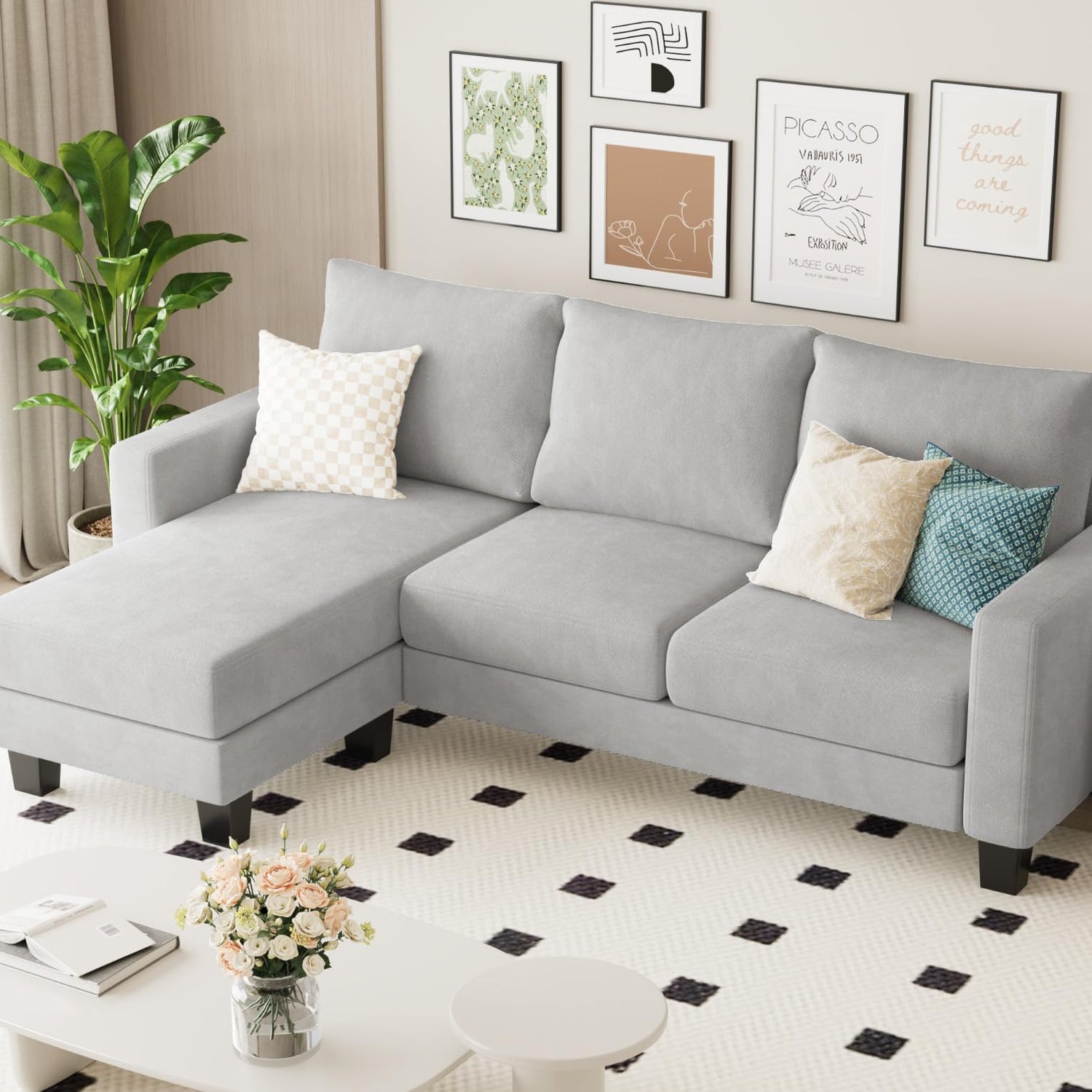 Homall Sofa for Living Room, Couch with Convertible Chaise, 3 Seat L-Shaped Sofas, Comfy Fabric Couches for Apartment, Small Space, Pale Gray
