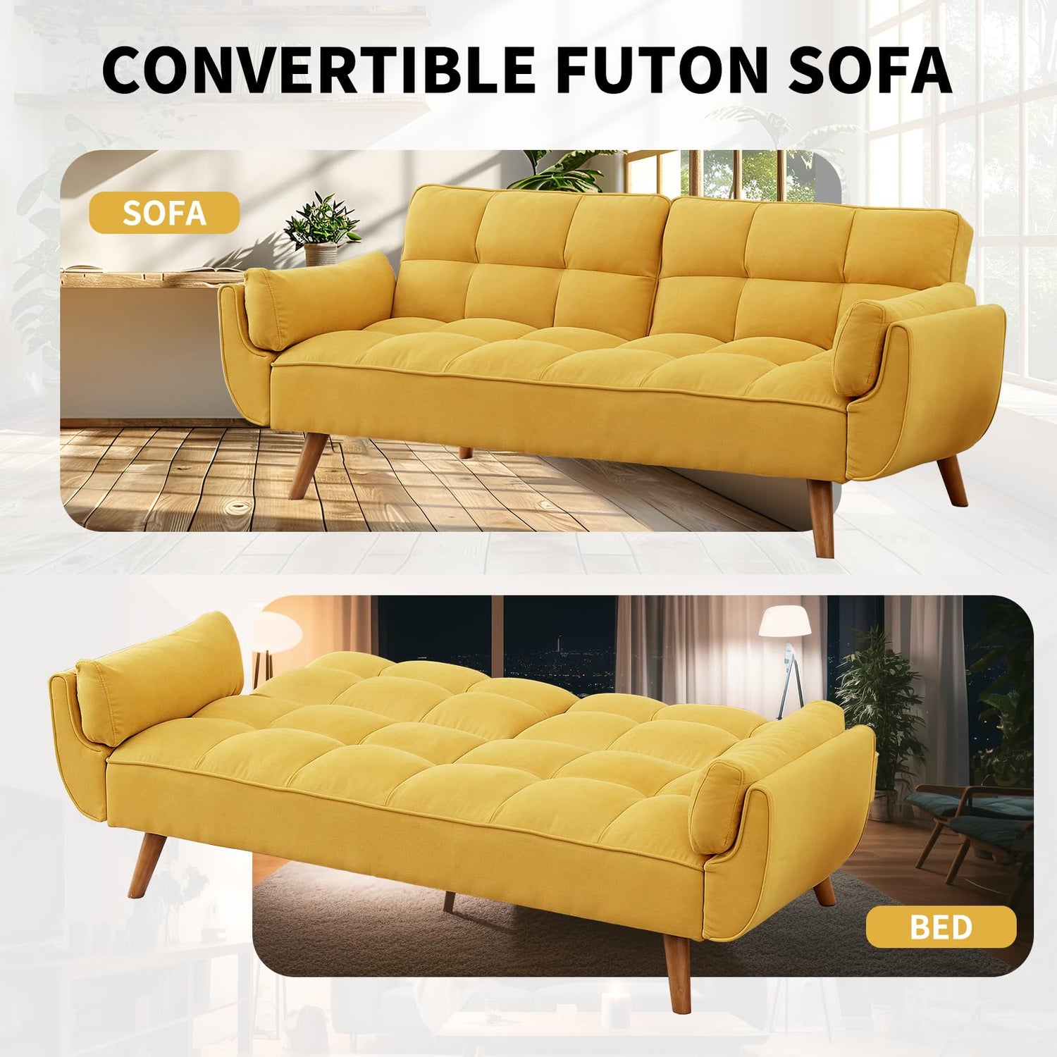 Homies Life Convertible Futon Sofa Bed, Linen Sleeper Couch, 75" W Modern 3 Seater Tufted Sofa with Adjustable Backrests and Solid Wood Legs for Small Spaces, Living Room, Bedroom, Golden Yellow
