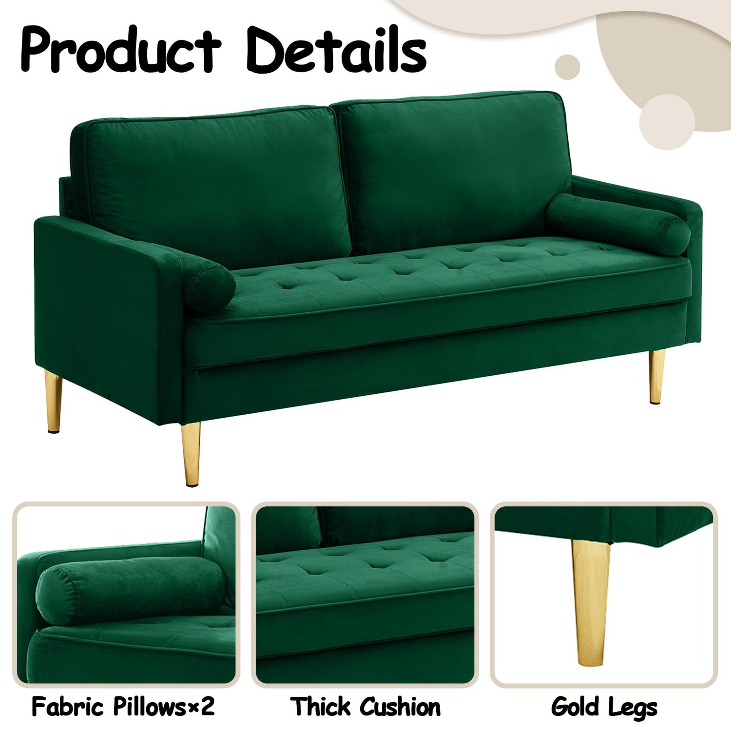 • Modern Velvet Loveseat: This loveseat for small spaces is the perfect mix of comfort and modern style; Designed with luxurious green velvet, a button-tufted seat, bolster pillows, and gold metal legs, it adds a sleek and elegant touch to any room