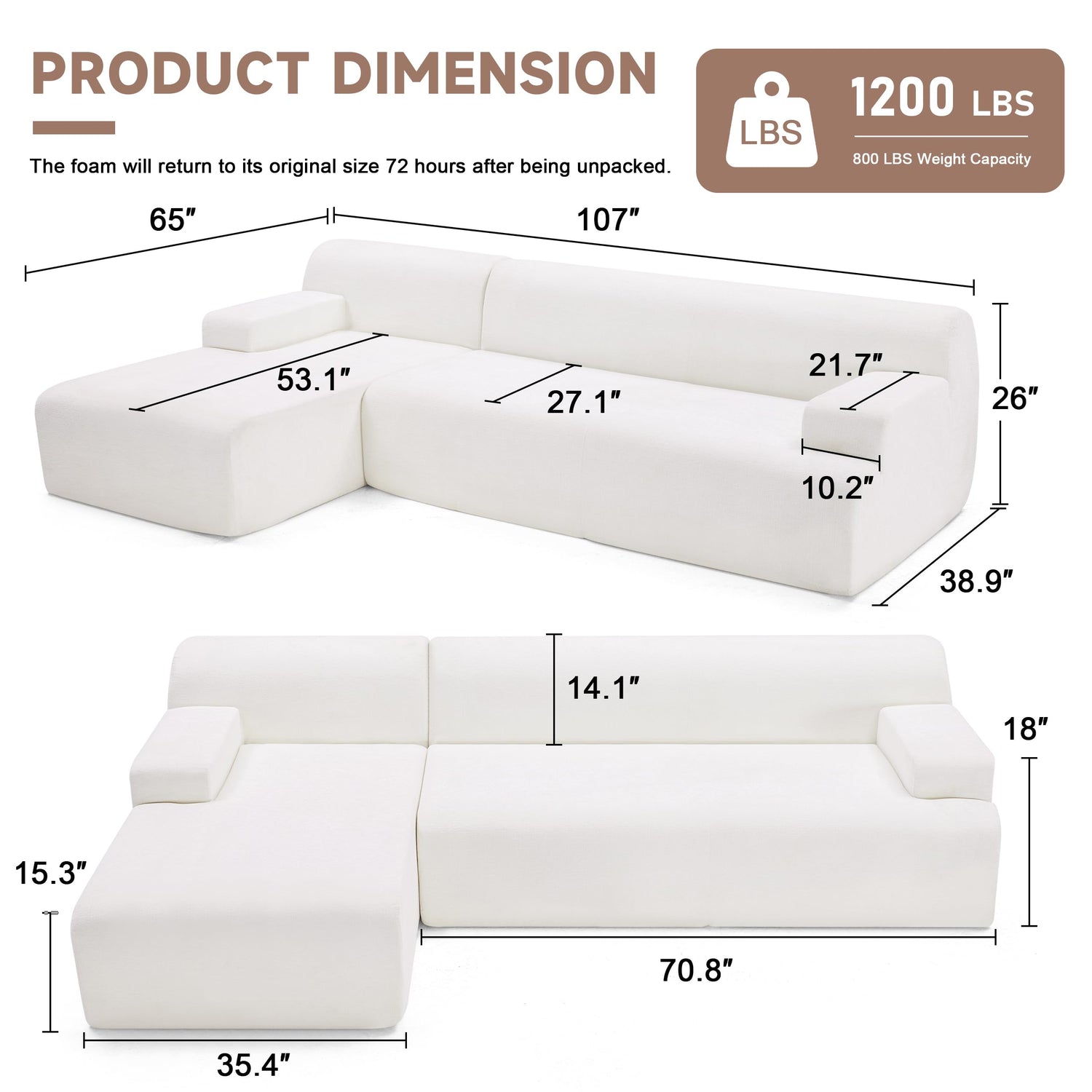 Huatean Home 107" Modular Sectional Sofa, Sponge Sectional Sofa Couch for Living Room, High Density Sponges Cloud Couch,Modular L-Shape Sofa Couch with Chaise, White
