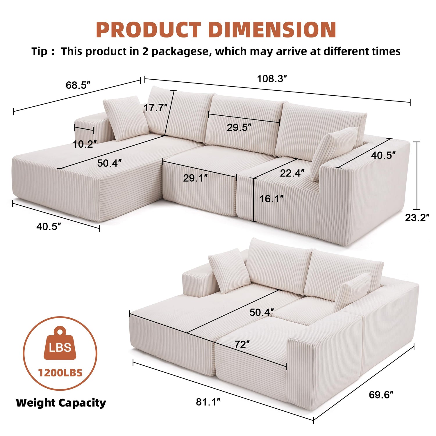 Huatean Home 108” Modular Sectional Sofa, Sponge Sectional Sofa Couch for Living Room, Modular L-Shape Sofa Couch with Chaise, Ivory