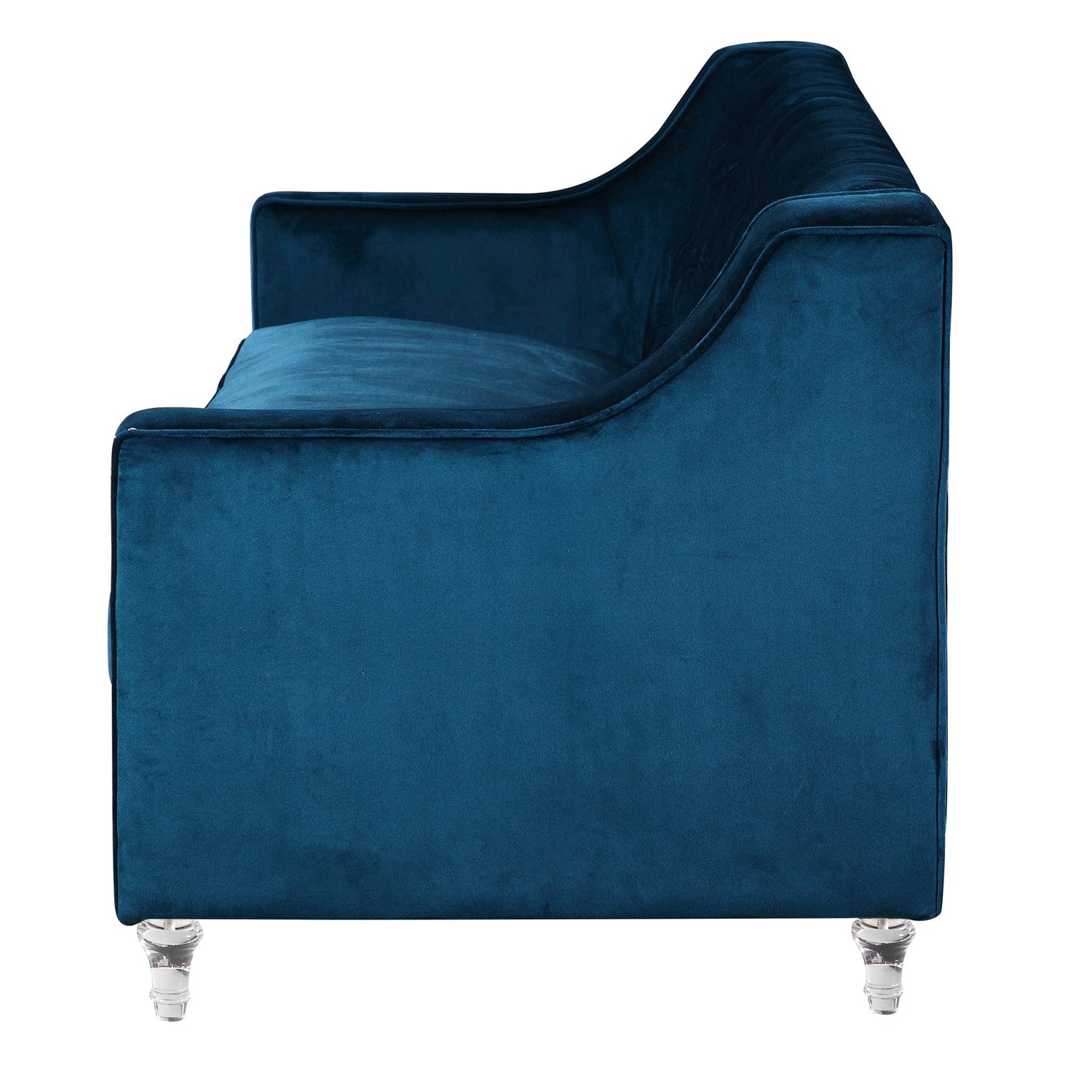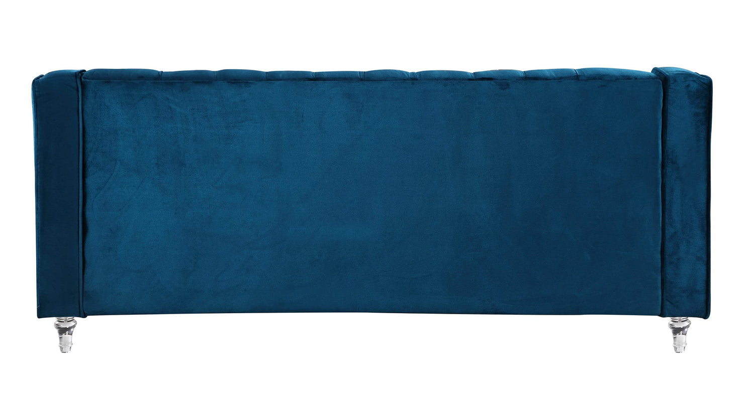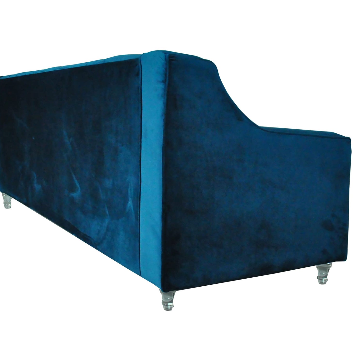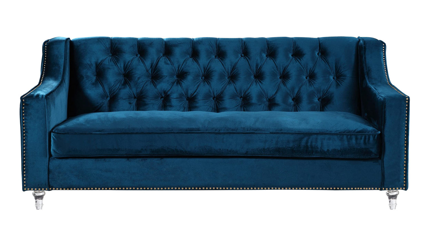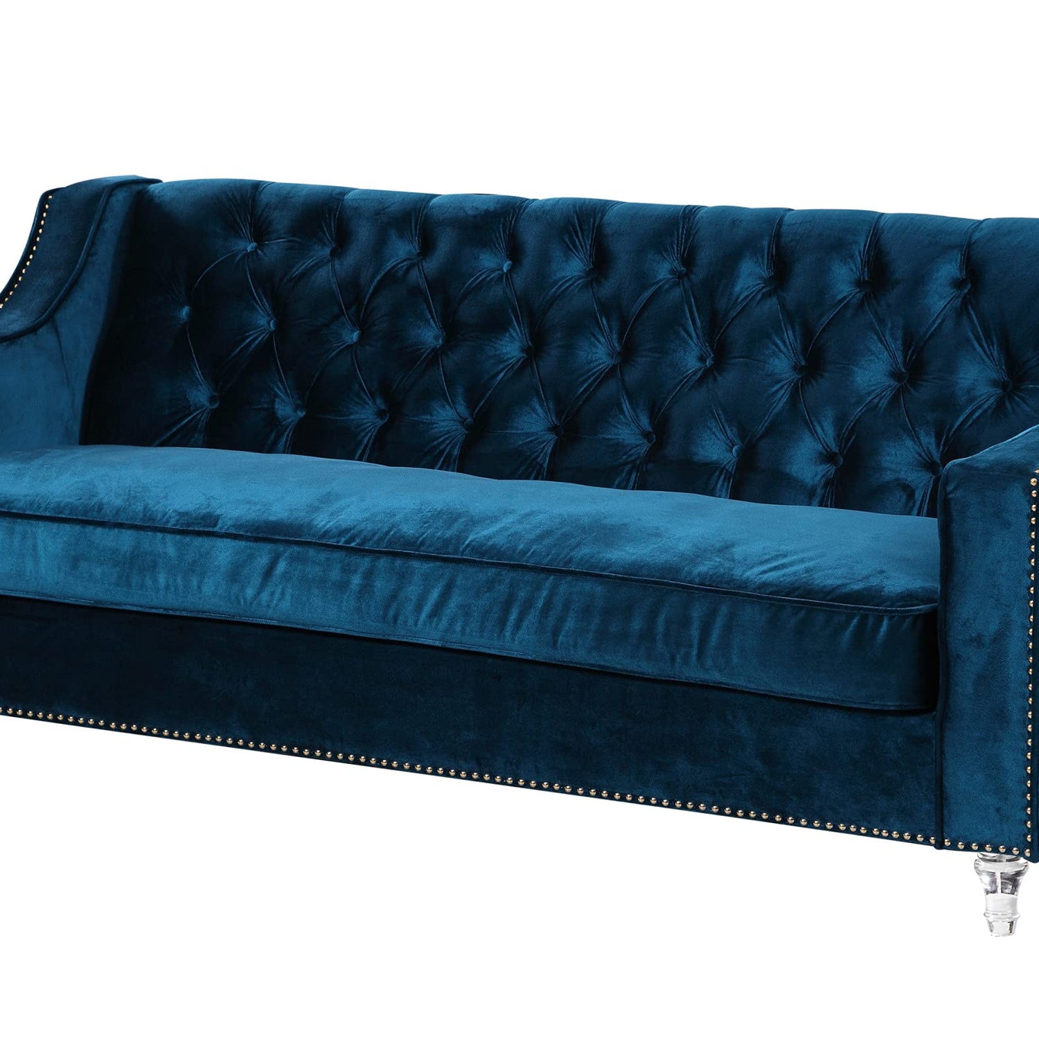 Details: Chic Home navy blue velvet sofa exudes an elegant sophistication in your home or office. Curl up with a good book, or take a quick load off your feet. This stylish sofa features rich hued buttery soft velvet, button tufting with contrasting silver naihead trim beautifully crafted sloped arms, high density foam padding, and sculpted round acrylic feet to provide comfort without sacrificing style.