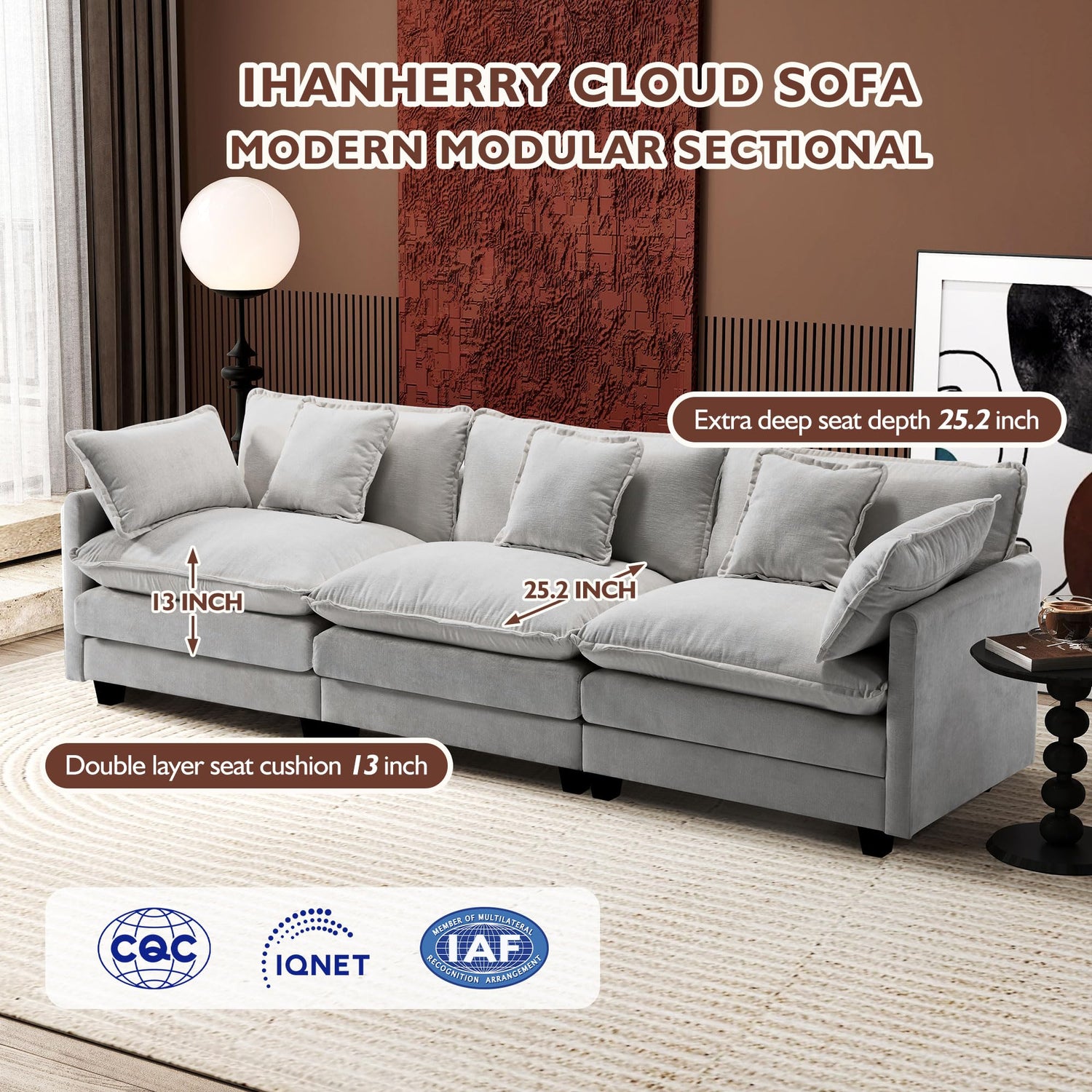 Ihanherry 111.4 Inch 3-Seater Cloud Sofa, Modular Sectional Couch, Modern Deep Seat Sofa for Living Room, Comfy Double Layer Upholstered Seat Cushion, Breathable Chenille Fabric, Grey