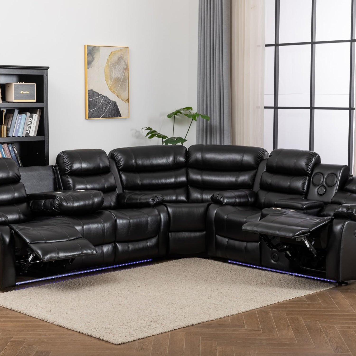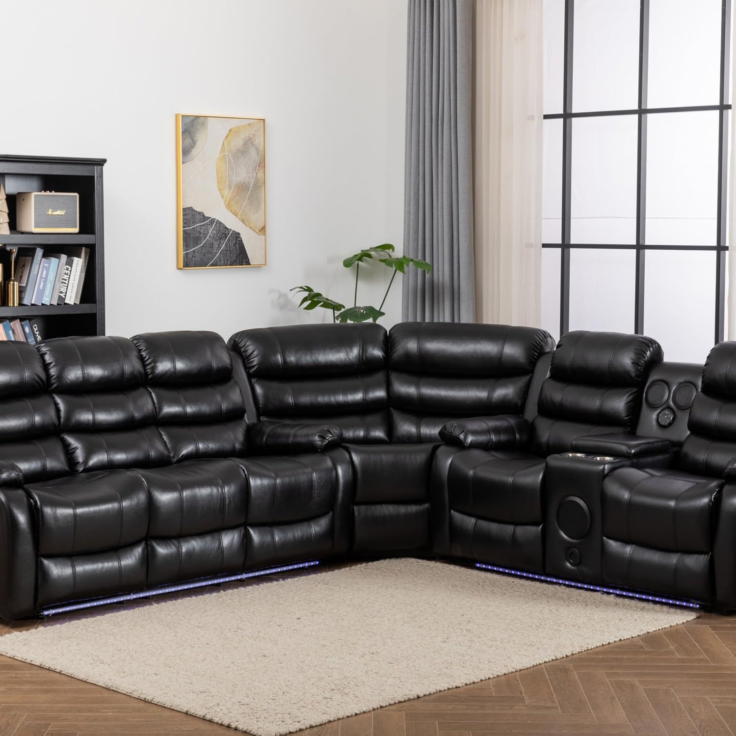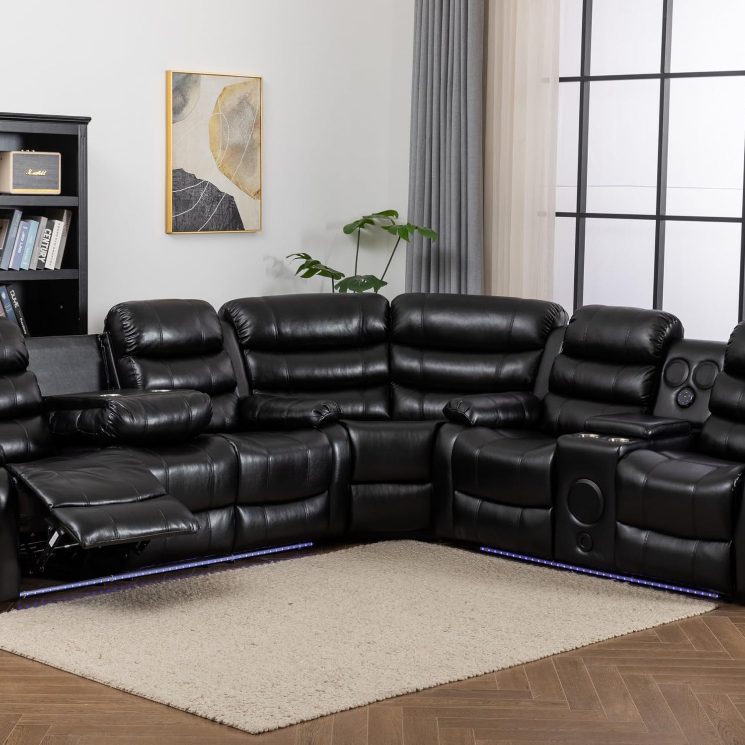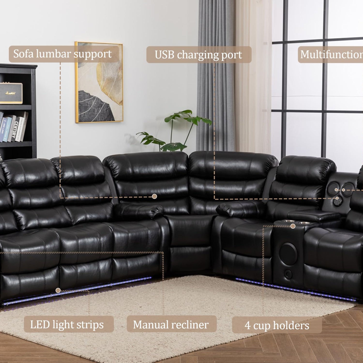 INSTORY 6-Seater Reclining Sofa Set, Faux Leather Living Room Set, Bluetooth Speakers, LED Lights, Drop Down Table, Cup Holders, USB Outlet, Storage Box (Black)