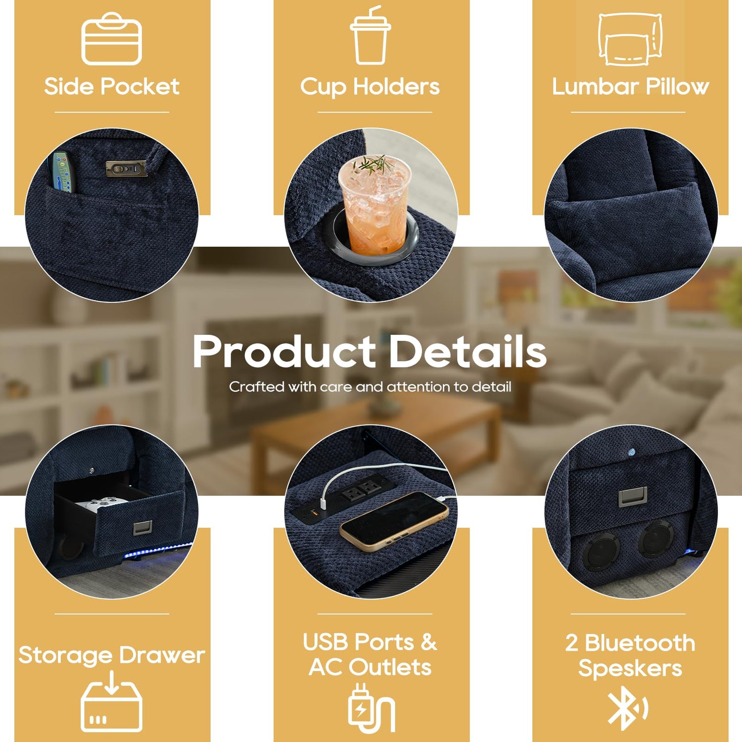 - Rich Features Center Console: Turn your recliner into a workstation or snack station! Drop down the console backrest to reveal a spacious tabletop for laptops, meals, or games. Stay organized with dual cup holders, a storage drawer, and charging ports (AC + USB/Type-C). Built-in Bluetooth speakers deliver immersive sound—meeting all your entertainment and relaxation needs