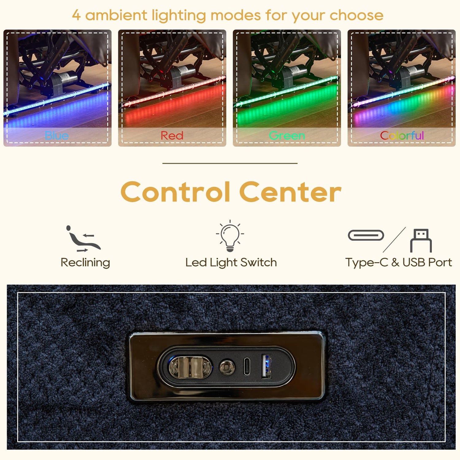 - Well-Designed Control Center: Unlike other power recliner sofa, we designed the control center on the outside of the armrests so that you do not block your movement when you connect the usb charging. Through it, you can always adjust your recliner, light switch and color change