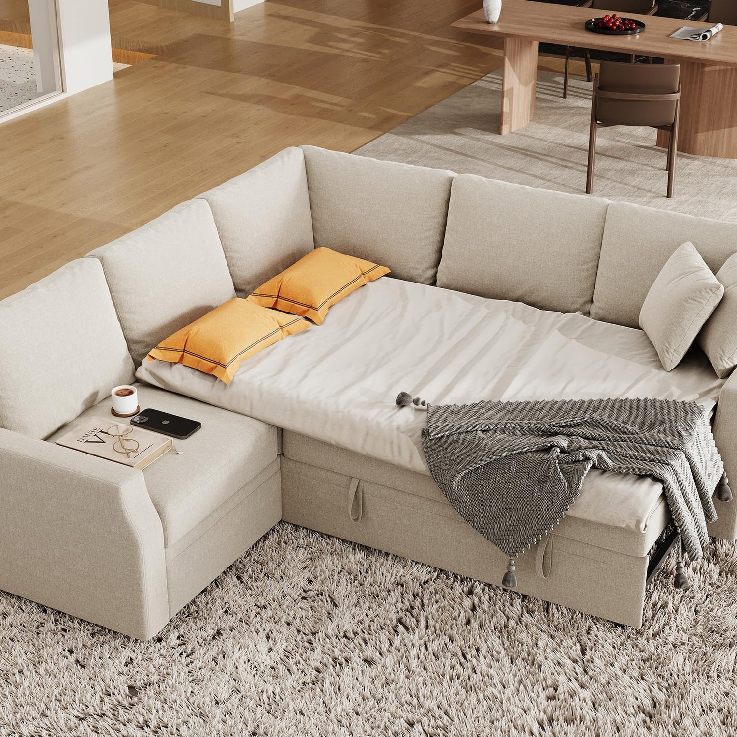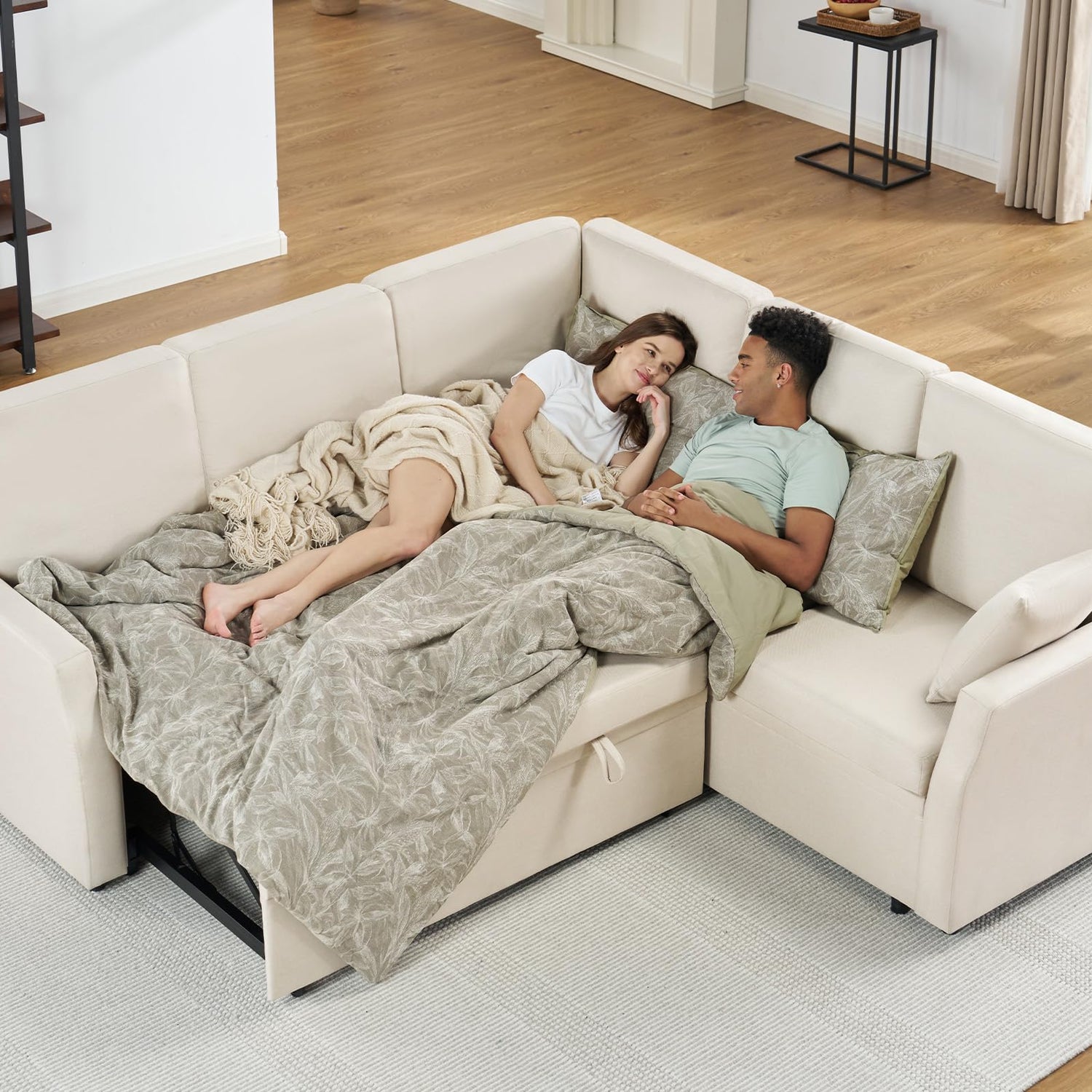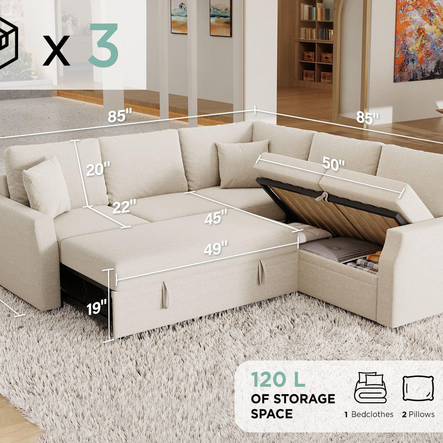 Jocisland Sofa Bed, 85 Inch Sleeper Sofa with Pull Out Bed & Storage Seat, Reversible L Shape Sectional Couch for Living Room Apartment, Beige Linen Oversized Sofa
