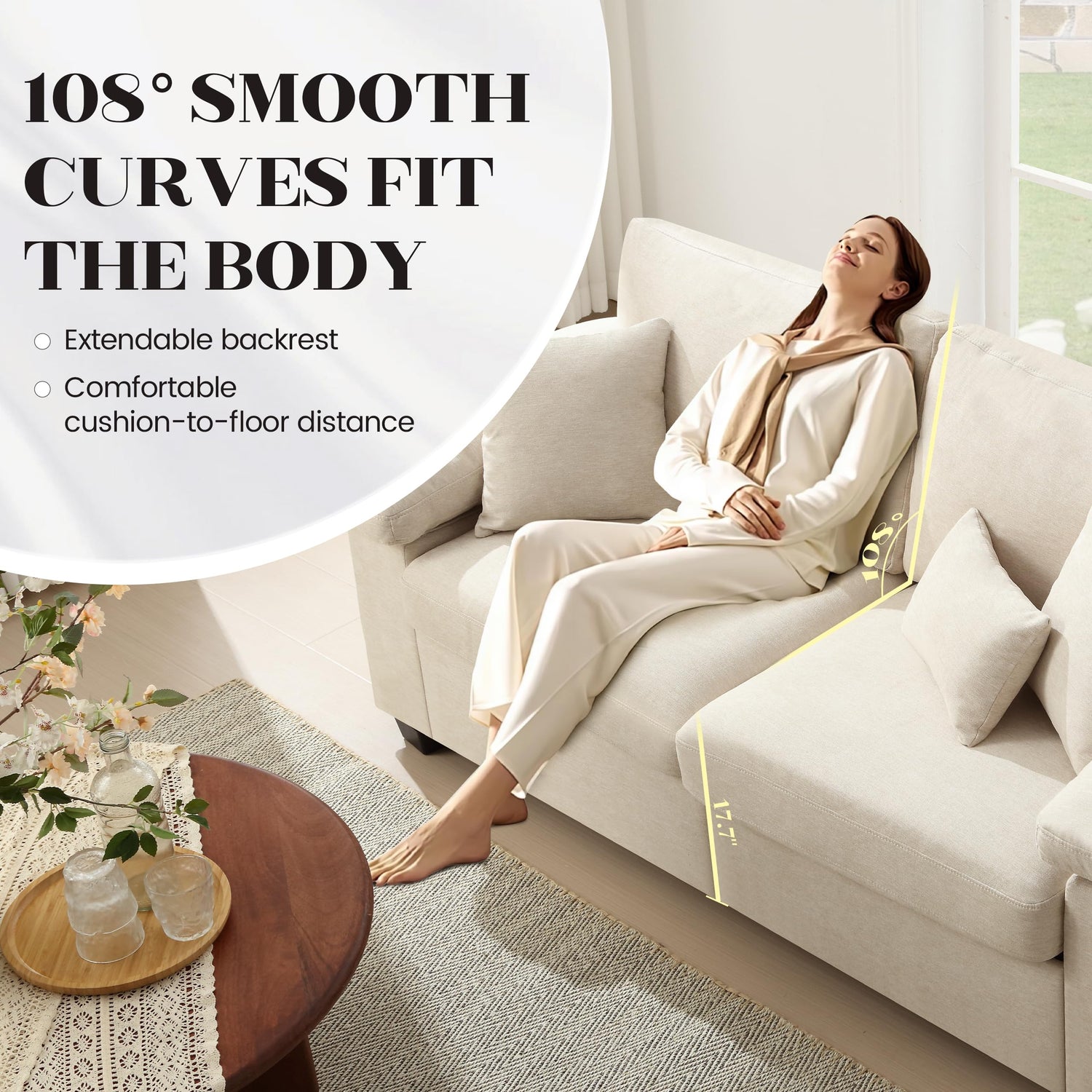 - ☁️【Experience the Feeling of Sitting on the Cloud-Worthy Comfort】 Your body is supported by the 5.5-inch thicken cushion with soft supportive high-density sponge, better elasticity for spring and comfortable cushion-to-floor distance that doesn't easily sink in when you sit or lie down. And for even more comfort, three pillows are included! Lock comfort and coziness firmly inside the sofa, and give you the feeling like falling into the clouds!