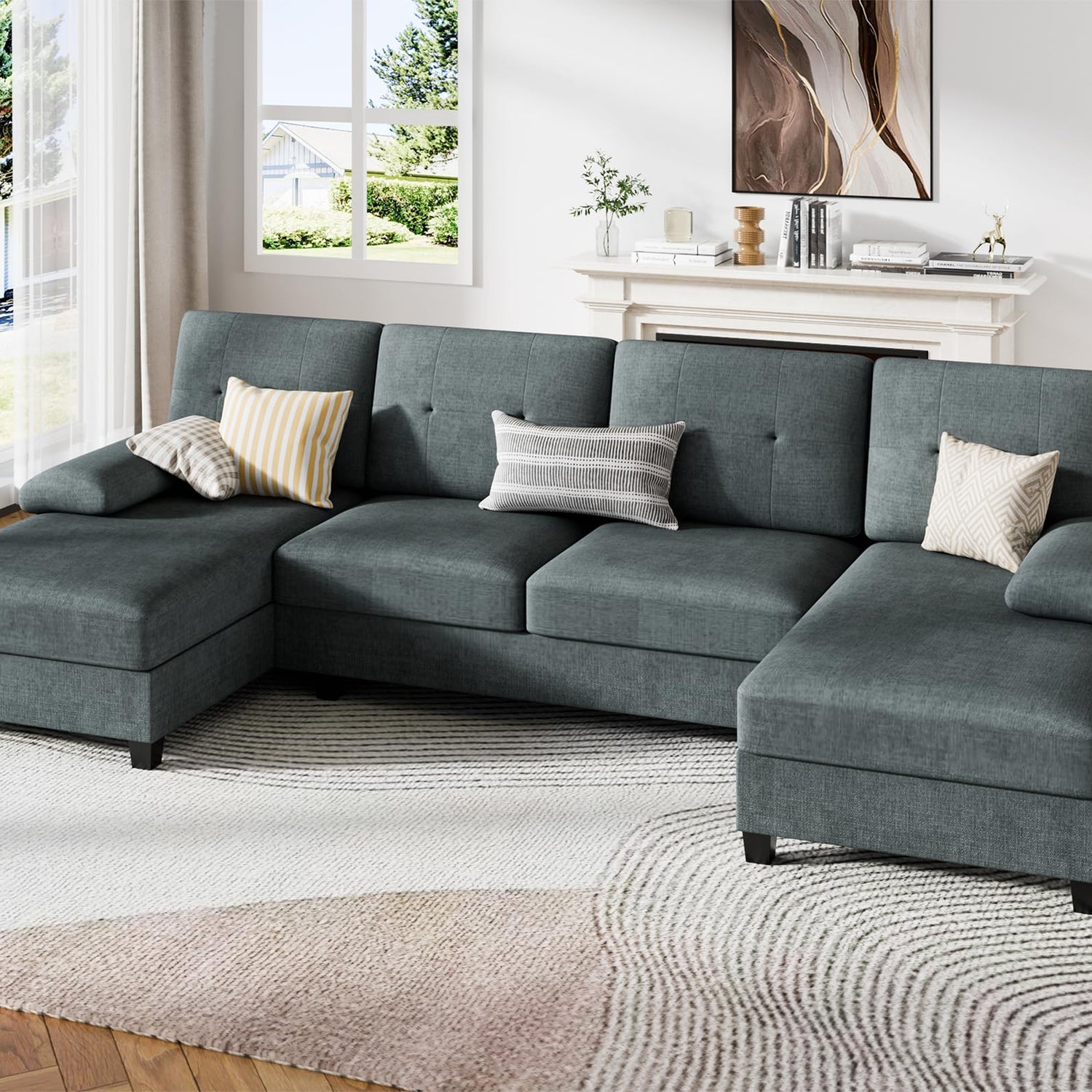 JY QAQA Sectional Couche with Soft Cushion, U-Shaped Sofa with Double Chaise, 4-Seat Linen Fabric Sofa Sets for Living Room, Apartment, Grey