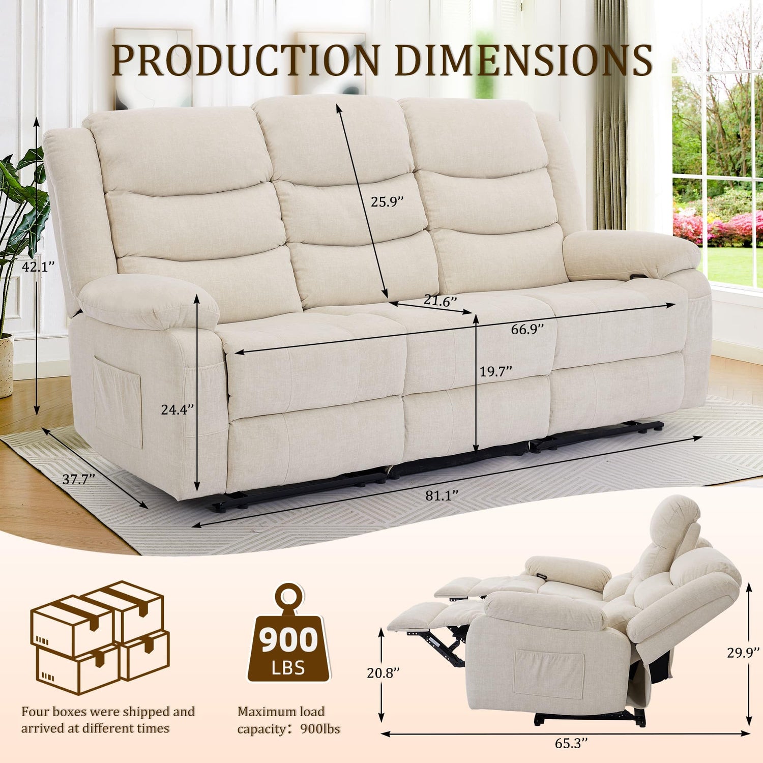 - Safe and Stable Support: Our recliner sofa features a sturdy metal frame at the bottom, which has been tested numerous times to provide stable support. Each seat can support up to 300 pounds, and the entire sofa can support a total of 900 pounds. Even three adults can sit together without any pressure. The footrest is designed with a 1.96-foot retractable support plate to support your legs and promote blood circulation.
