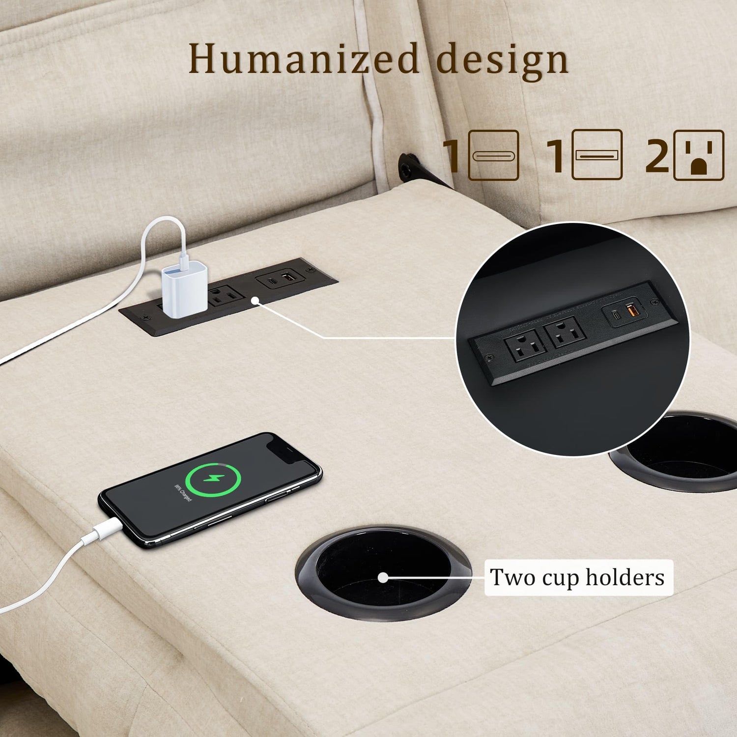 - Pull-Down Table with Charging Station: The sofa recliner's pull-down tray table is equipped with a US outlet, USB, and Type-C ports, allowing you to charge your smart devices without leaving your seat. It also features two cup holders. Whether you're looking for hot coffee or iced drinks, the dedicated cup holders provide secure storage. A storage pocket next to the charging station is perfect for storing daily necessities, enhancing your overall experience.