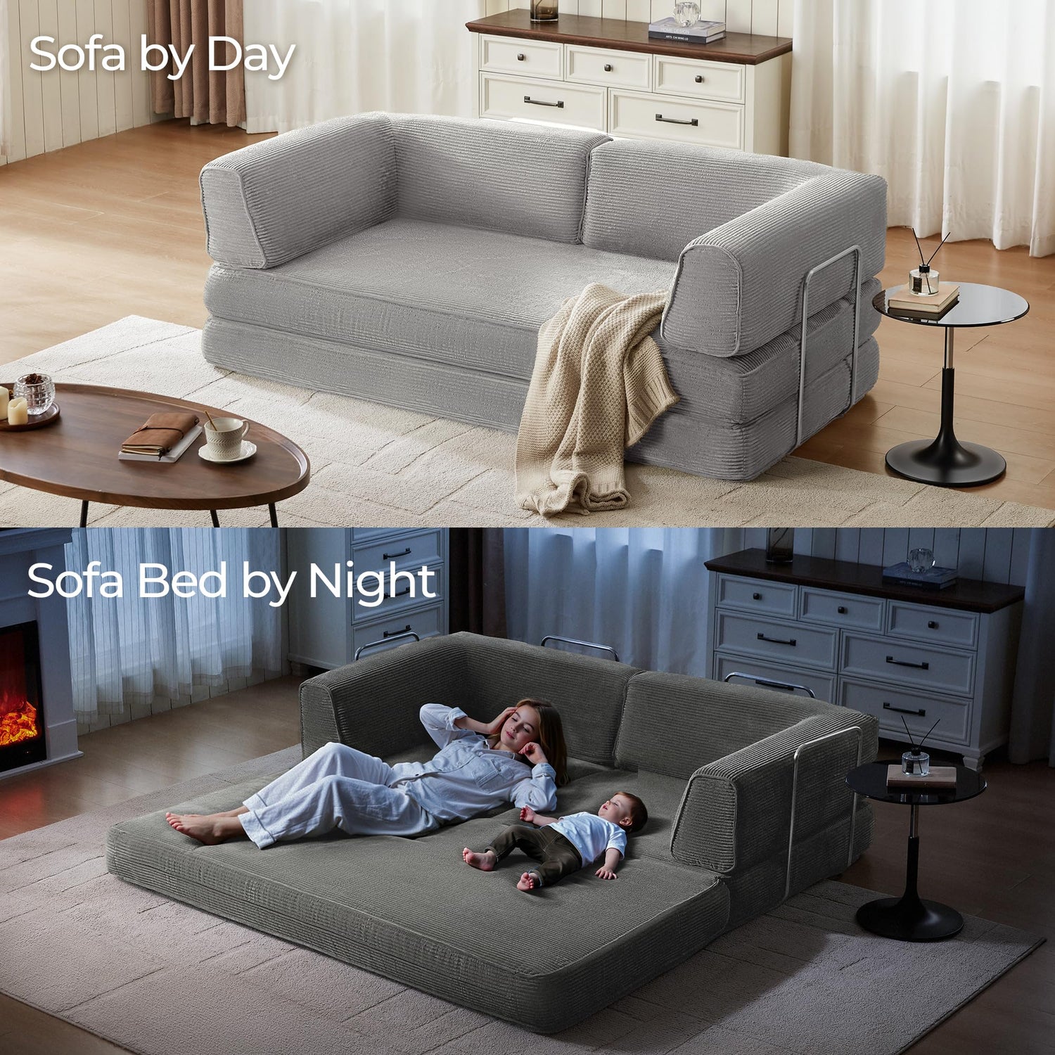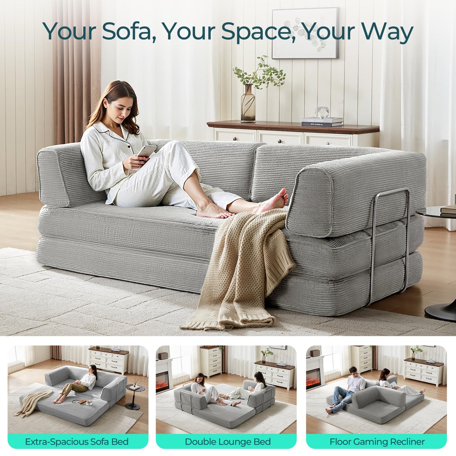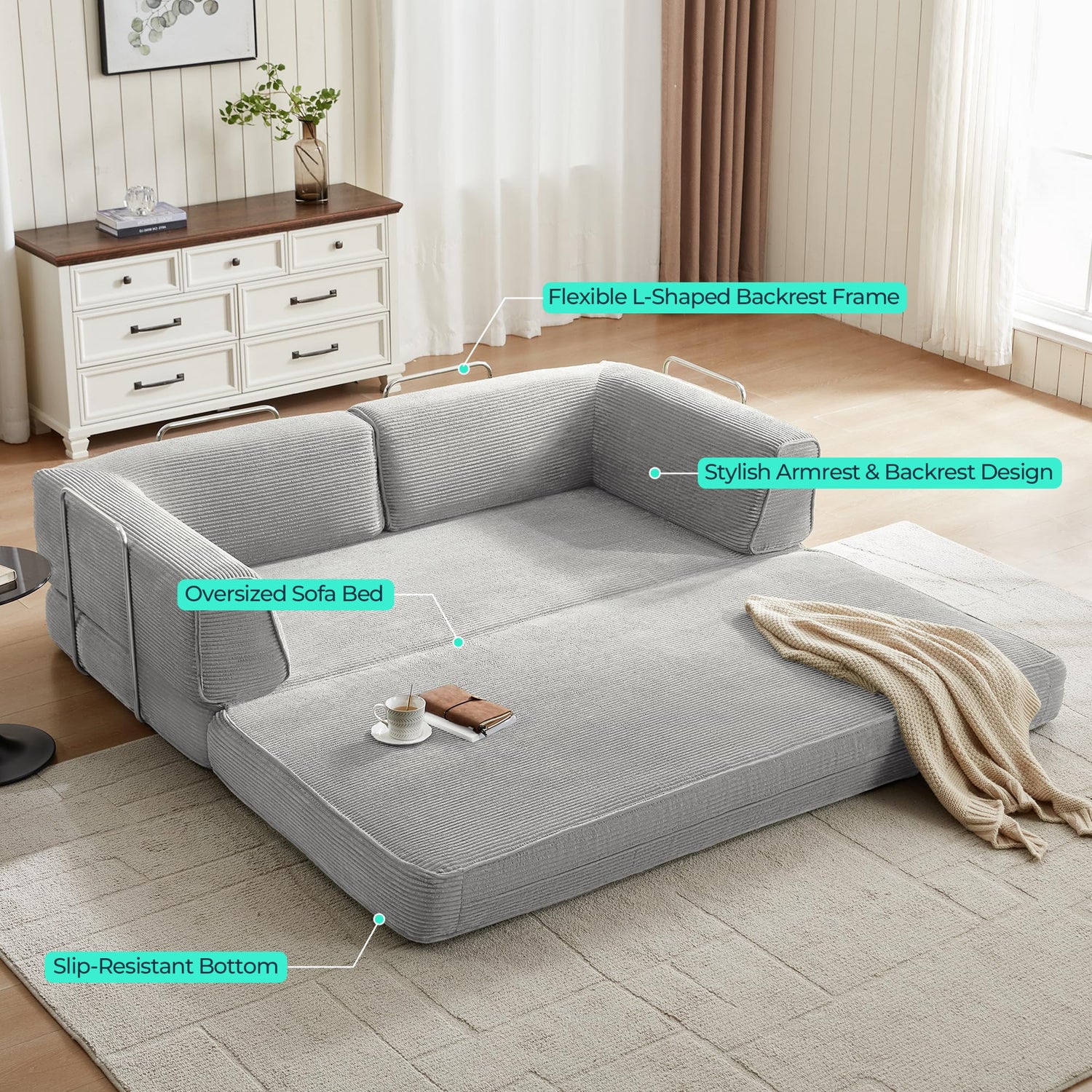 LINSY HOME 79'' Convertible Sofa Bed - Boneless Compression Sofa Folding Loveseat Sleeper - Foldable Corduroy Couch Bed for Living Room Bedroom - Modular Sectional Compressed Sofa in Box, Grey