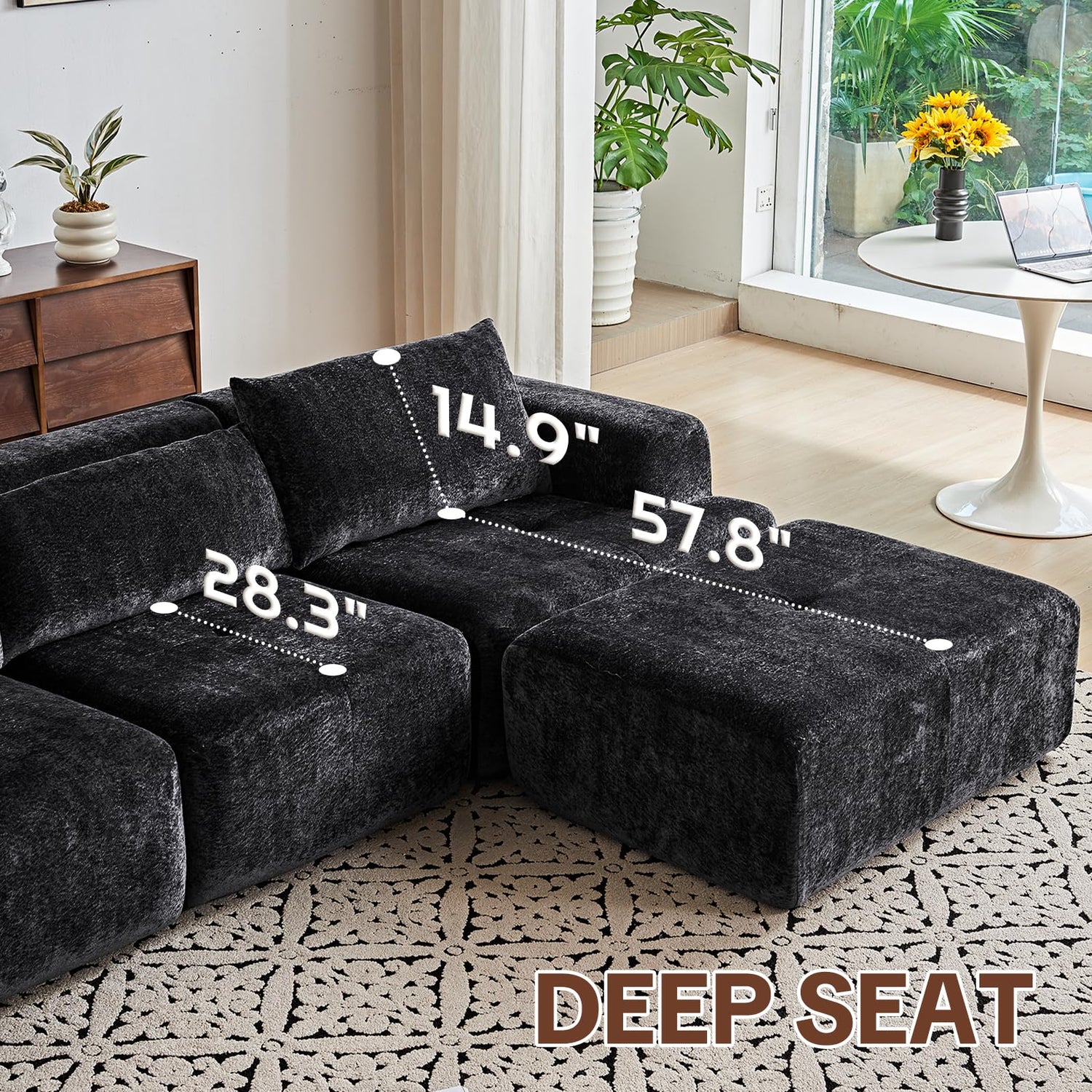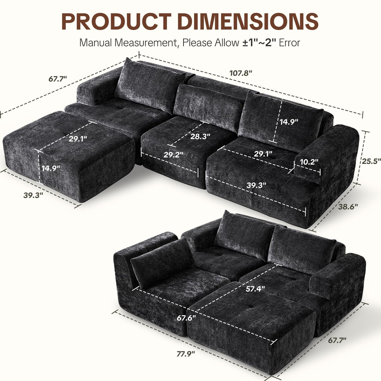• 【No Assembly】This modular sectional couch needs no assembly—just unbox, though this sectional couch takes 5-7 days to fully rebound, you can use as soon as you get it, skipping assembly hassle. And all components come in 1 package, no waiting for parts several times