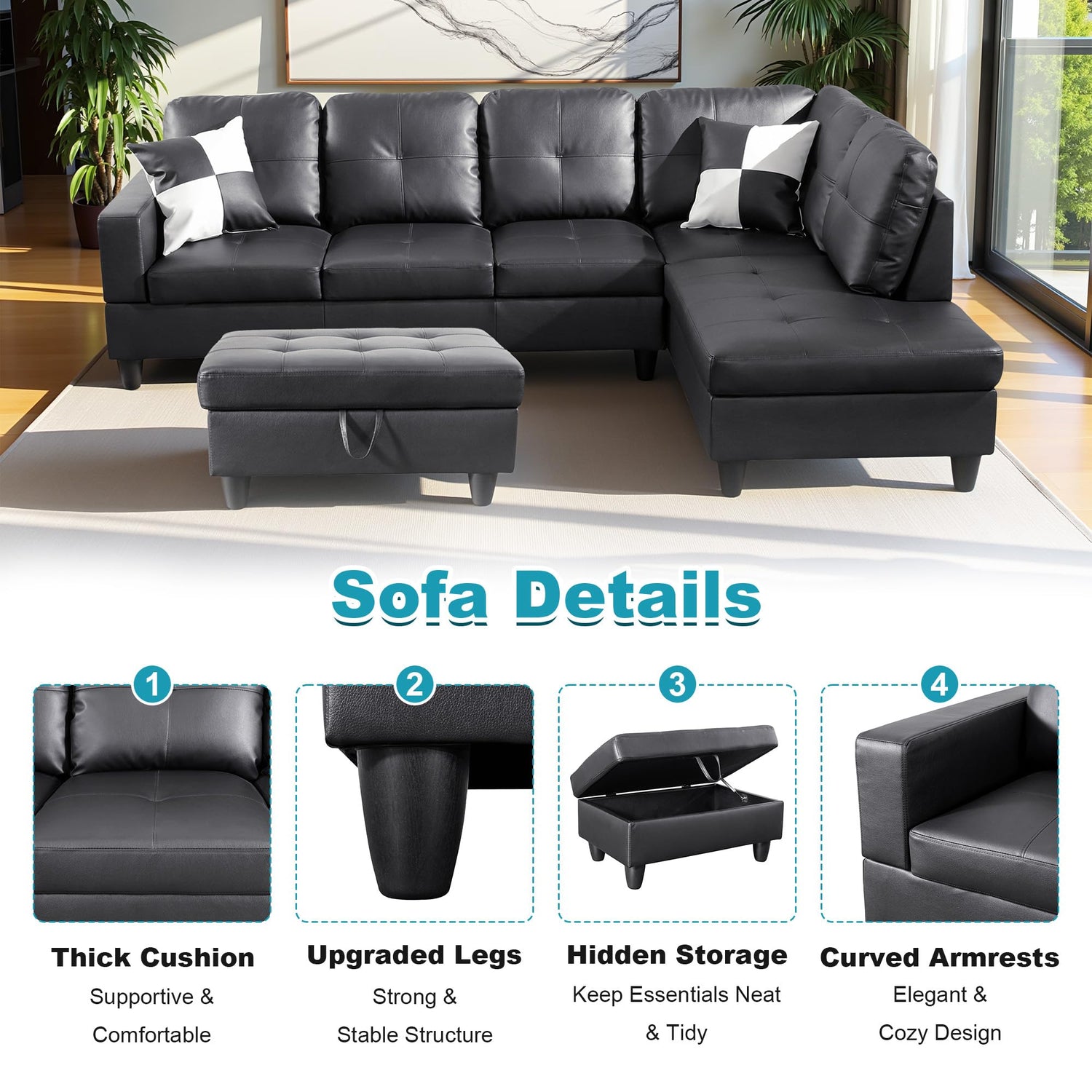 Details: This elegant L-shaped couch with ottoman combines timeless style and comfort, perfect for modern living rooms. Featuring soft, supportive cushions filled with high-density sponge and a sturdy wood frame with dual-layer springs, this sectional couch offers lasting durability. The ergonomic backrest enhances comfort, while the ottoman provides hidden storage for added functionality. A versatile modular sectional sofa that blends form and function seamlessly.