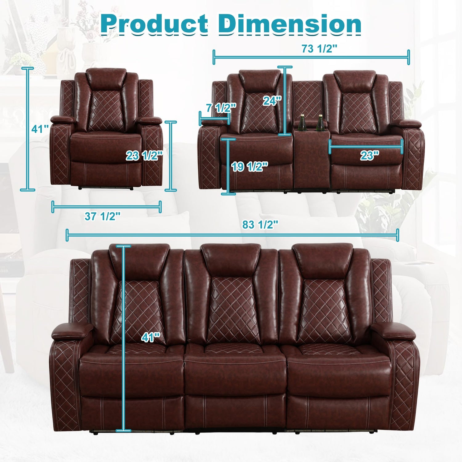 • Classic 3-Piece Recliner Set: This premium 3+2+1 recliner set includes a 3-seater recliner sofa, a 2-seater loveseat with center console, and a single recliner chair. Designed in a timeless modern style with exquisite craftsmanship and luxurious black breathable leather to elevate any living space.
