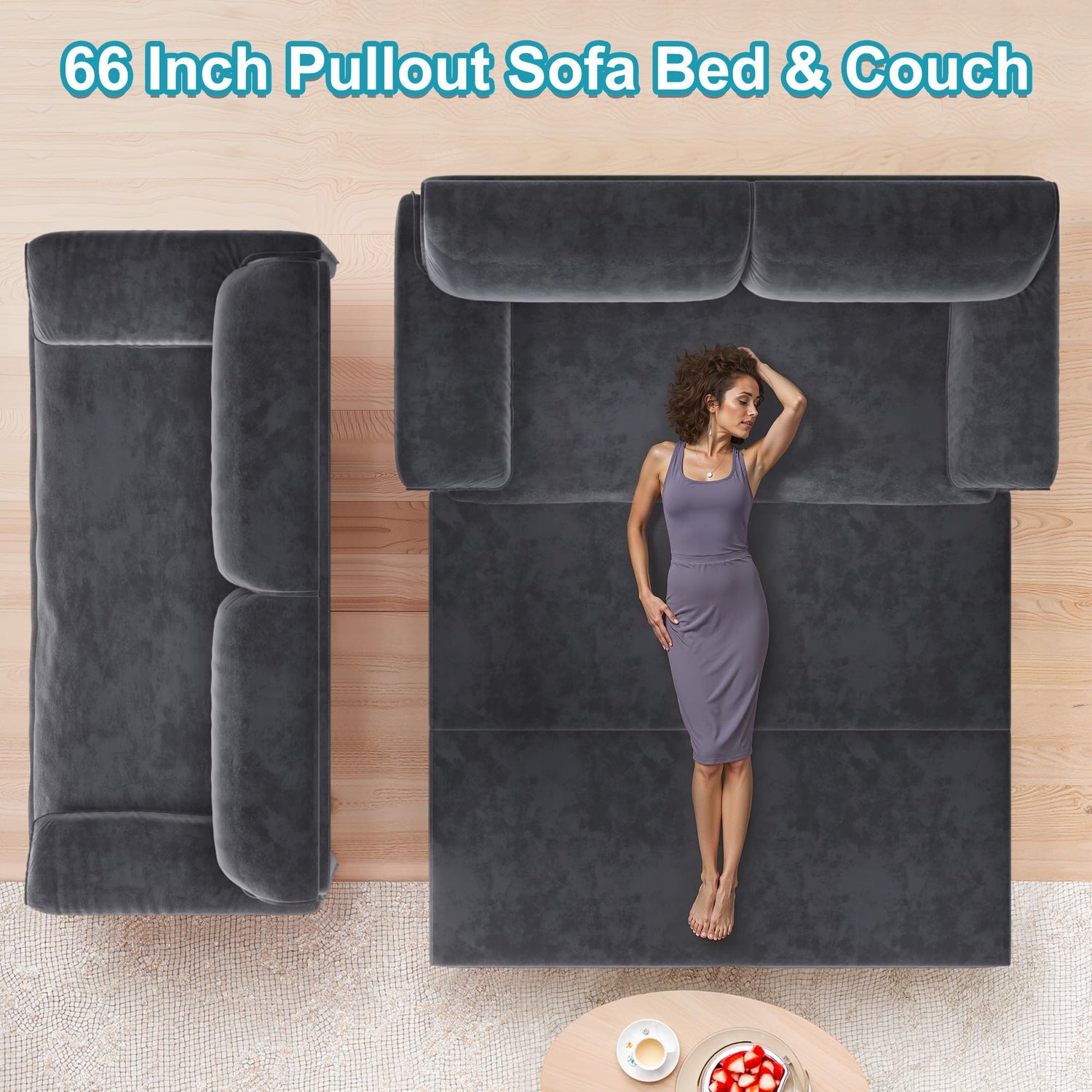Lyngins 66 Inch Queen Size Sleeper Sofa Bed, 3 in 1 Convertible Pull Out Couch Velvet Loveseat Sofa Couch Bed with Side Pockets for Apartment, Bedroom, Living Room, Dark Gray