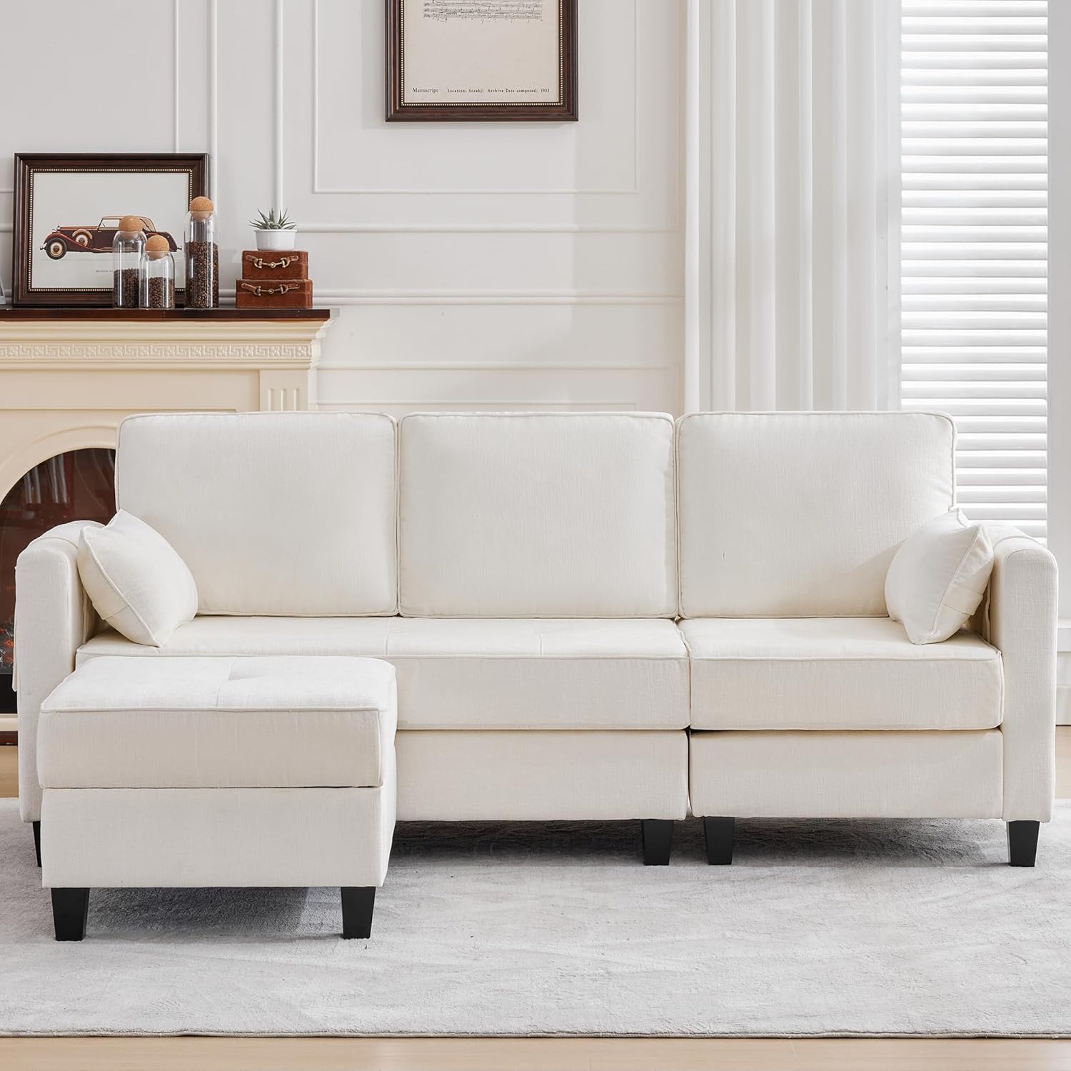 Made of high-density sponge, covered with breathable soft corduroy fabric,the sectional couch will provide you comfortable and soft cloud touch experience. The cushions are vacuum-packed. Thus, in order to get the best experience, please wait 48 hours to let it become the original shape.The 3-seater sofa has side pockets on the sides, providing plenty of space for magazines, remote controls, and more.The additional storage function under the ottoman is not only a mecca for children's toys, but also for storing blankets and various items to make the room look neat and clean