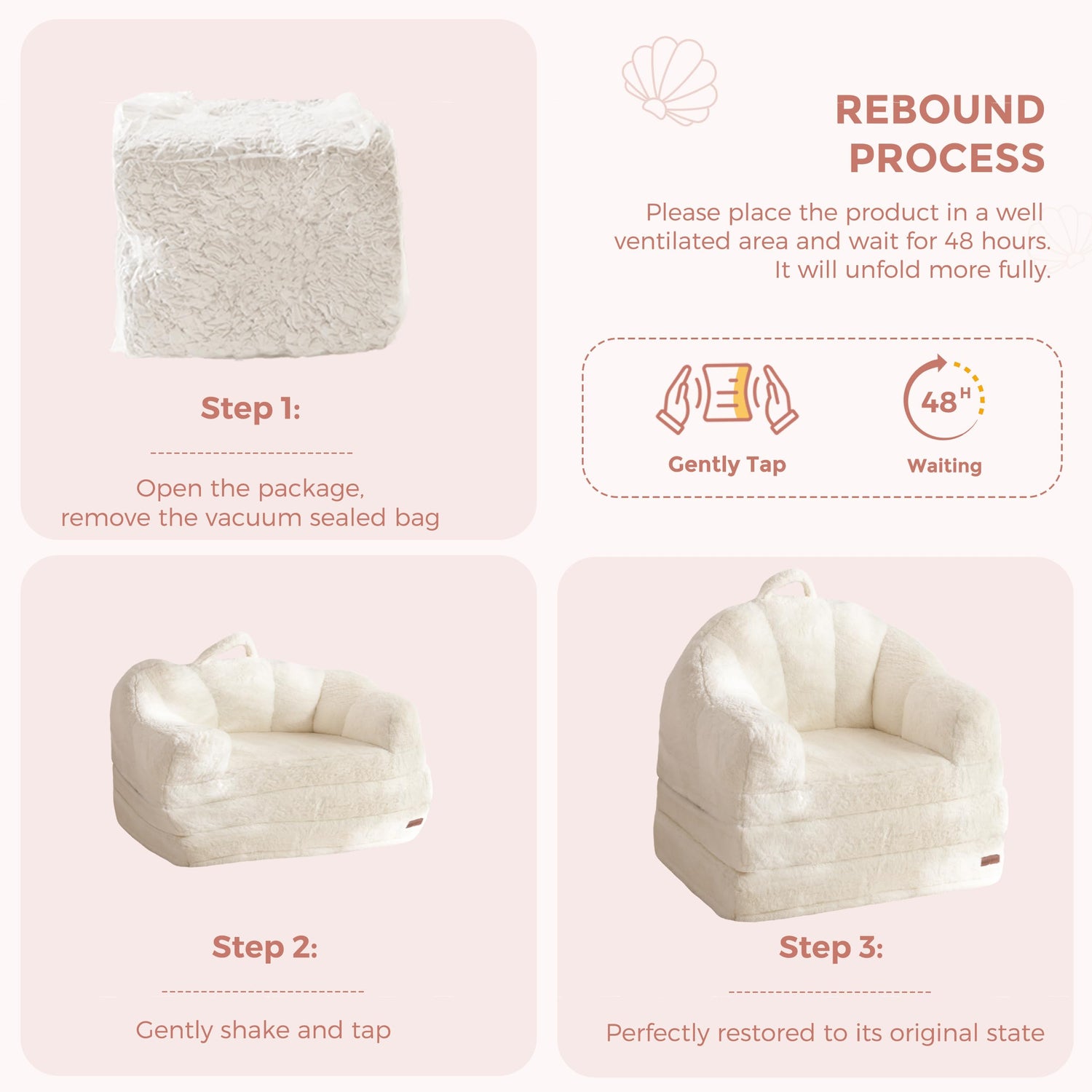 • Shell-Shaped Backrest: The curved, scalloped backrest is inspired by seashells, bringing playful charm and visual texture to any room. It doubles as a cozy cushion for your back and a standout decorative feature in your space.