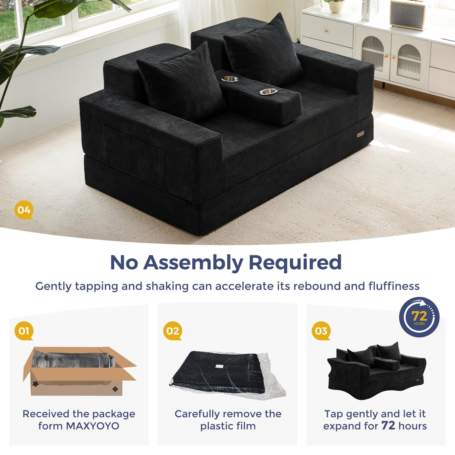 MAXYOYO Loveseat Sofa Bed, 4 in 1 Foldable Floor Sofa Couch in A Box with 2 Cup Holders, Convertible Boneless Couch Folding Recliner Sleeper Chair for Living Room, No Assembly Required, Black
