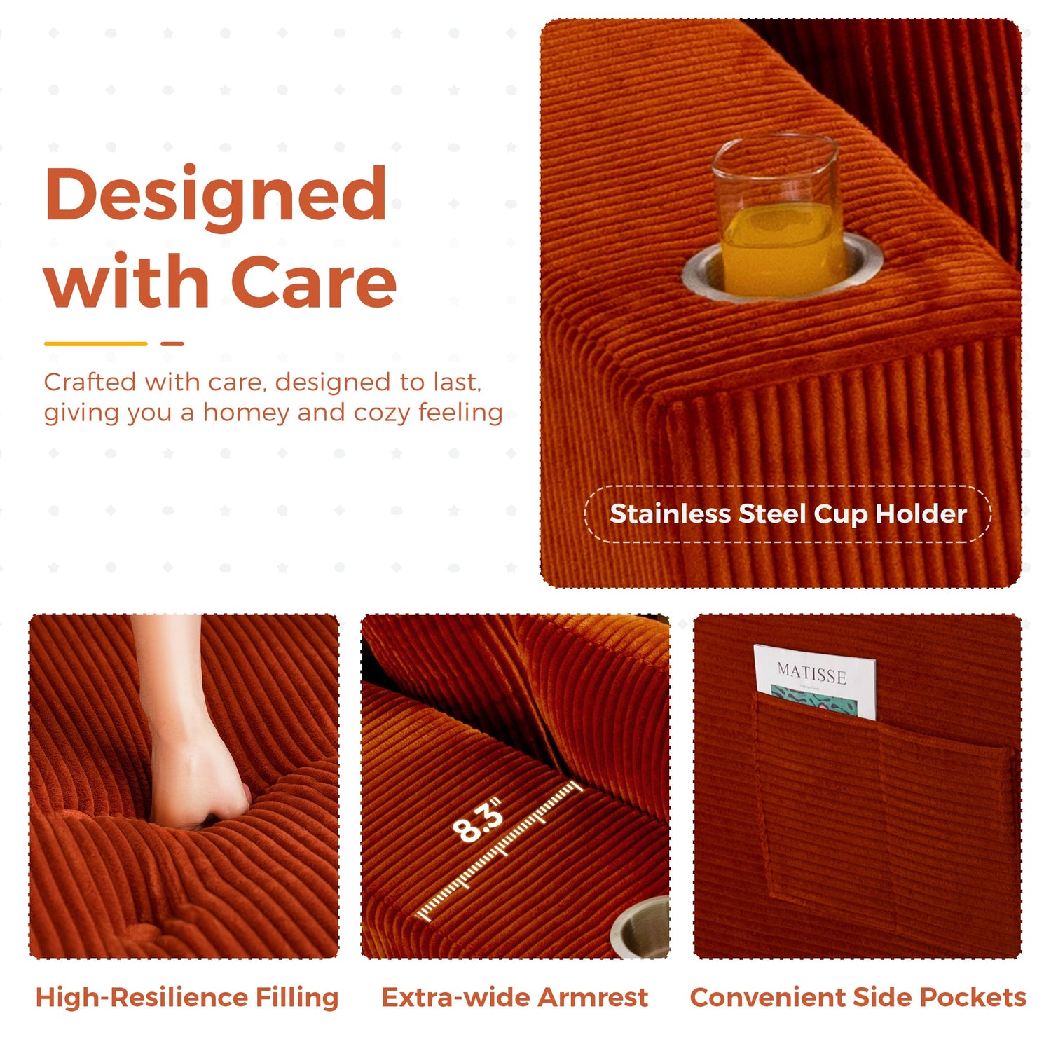 • Soft Corded Fabric: Upholstered in premium corded fabric, the sofa surface is soft, breathable and skin-friendly. It brings serene warmth, offering soft comfort. Its ribbed texture adds depth and modern style, making it a cozy focal point in any living room or lounge space