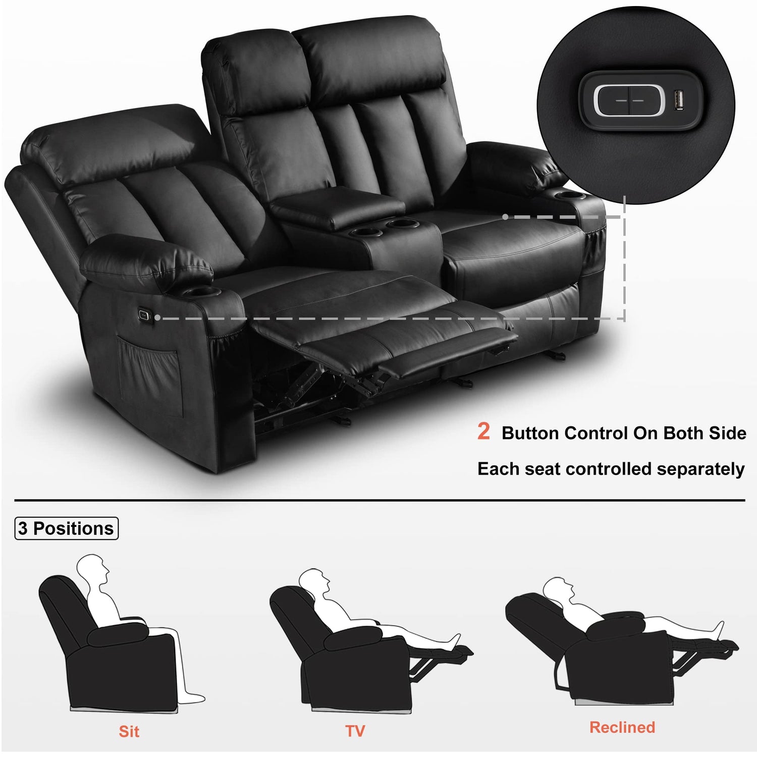 MCombo Power Loveseat Recliner with Console, Heat and Vibration Massage, Reclining Loveseat Sofa with USB Ports, Cup Holders for Living Room, Faux Leather 6095 (Black)
