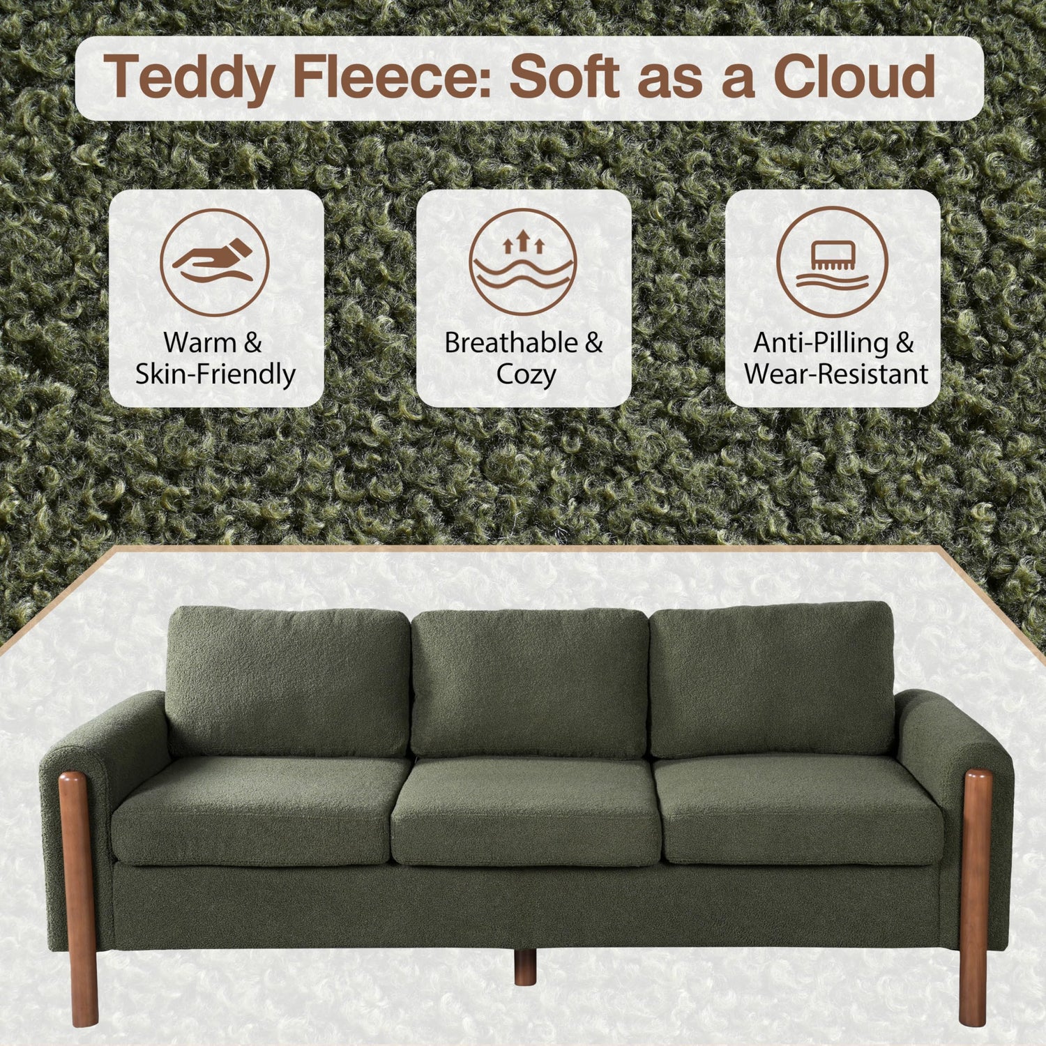 Merax 83.86" 3-Seater Sofa, Curved Armrest with Integrated Solid Wood Legs, Teddy Velvet Fabric, High Weight Capacity (250 lbs/seat), Durable Solid Wood Frame,Green