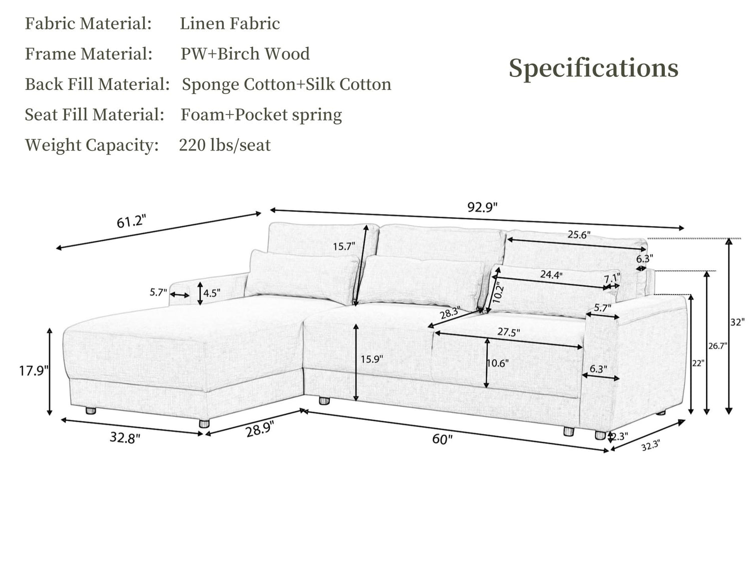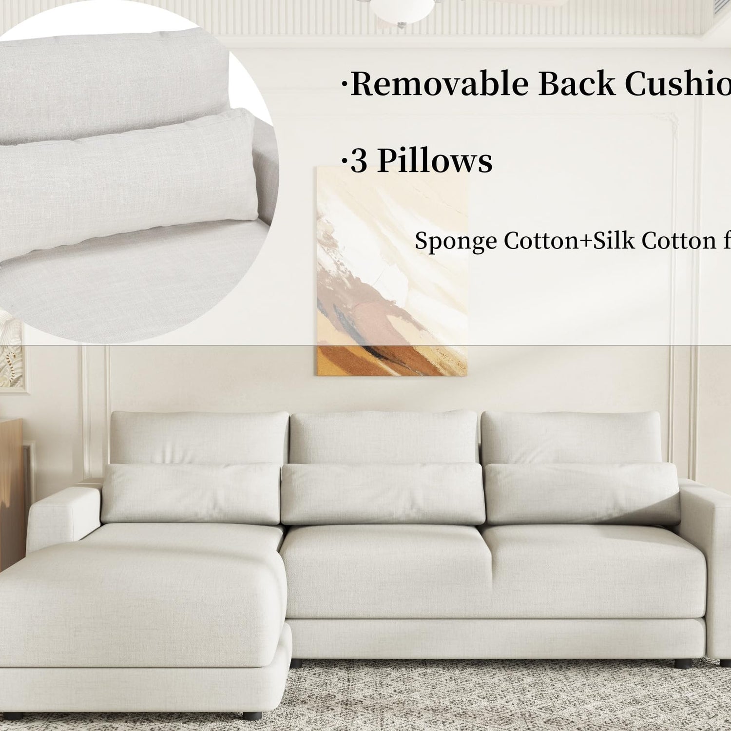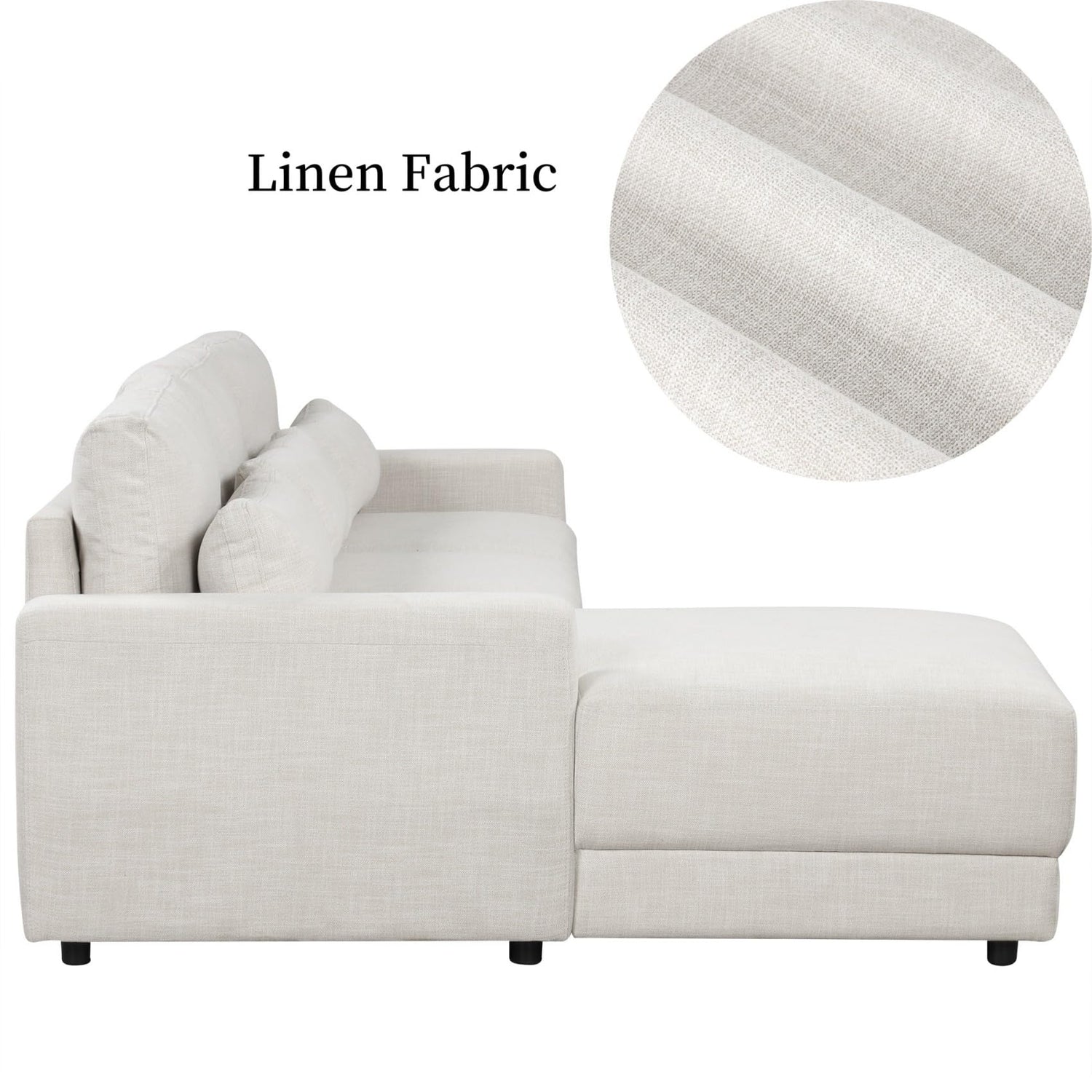 Merax 93"*61" Linen Sectional Couches with Removable Back Cushions and 3 Pillows, Birch Wood L-Shaped Upholstered Modular Sofa Chaise for Living Room, Offices, Apartment, Beige